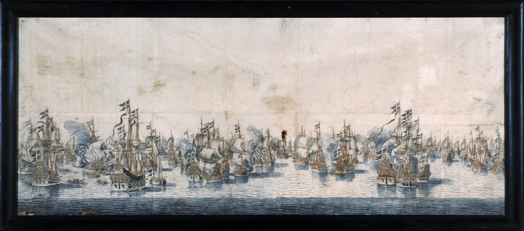 Sjöslaget vid Femern 1644 mellan svenska och danska fartyg. Tusch och sepialavering.