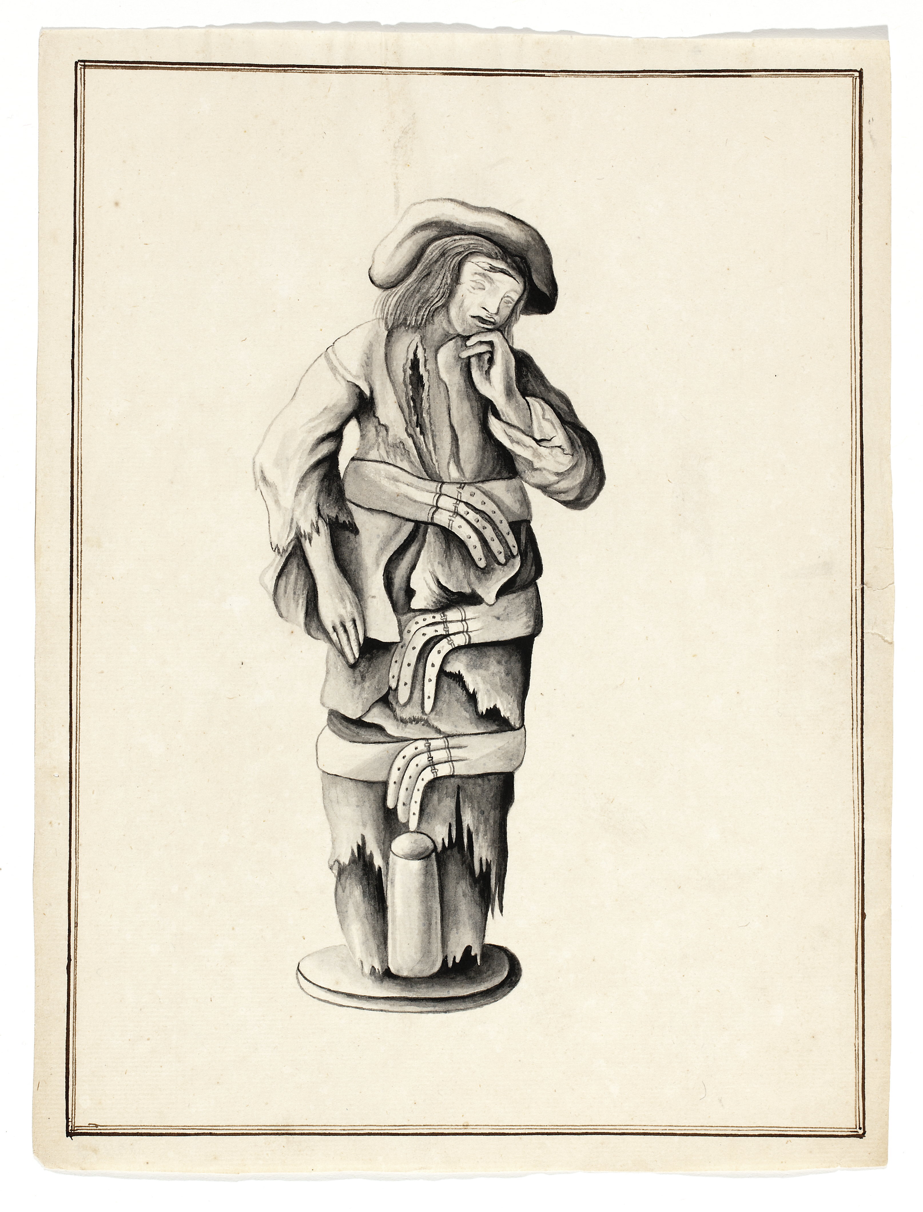 Teckning föreställande man i trasiga kläder fastspänd av breda bälten, 1700-tal.