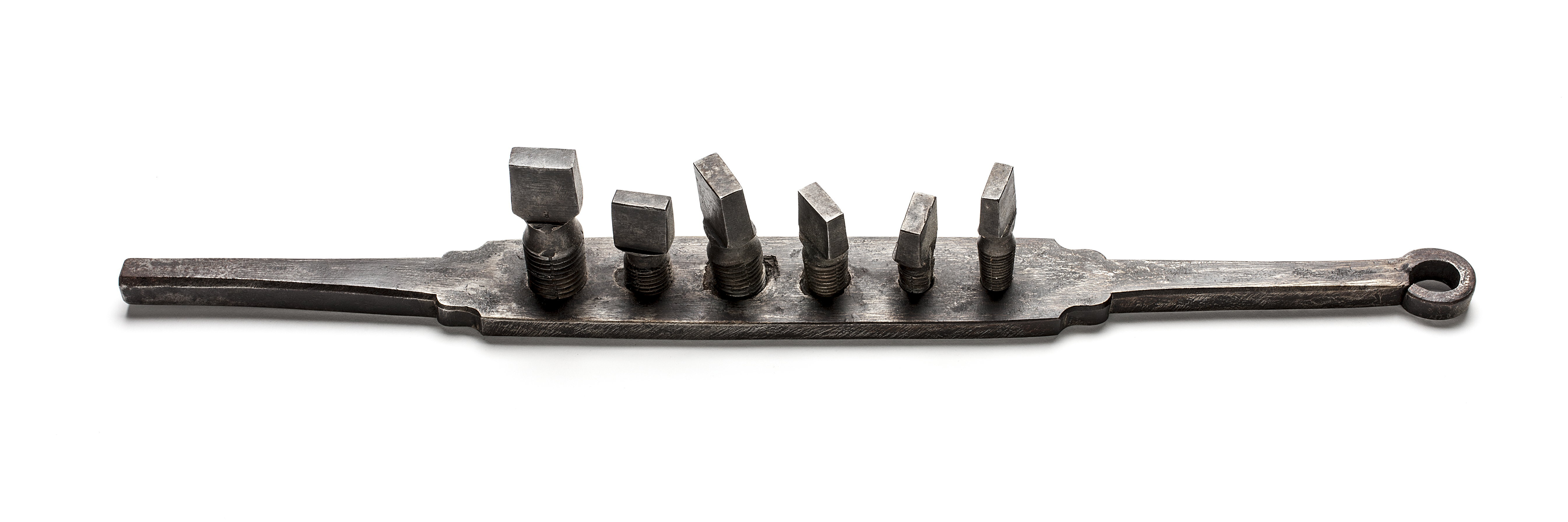 Gängskiva av stål med gänghål och gängtappar.