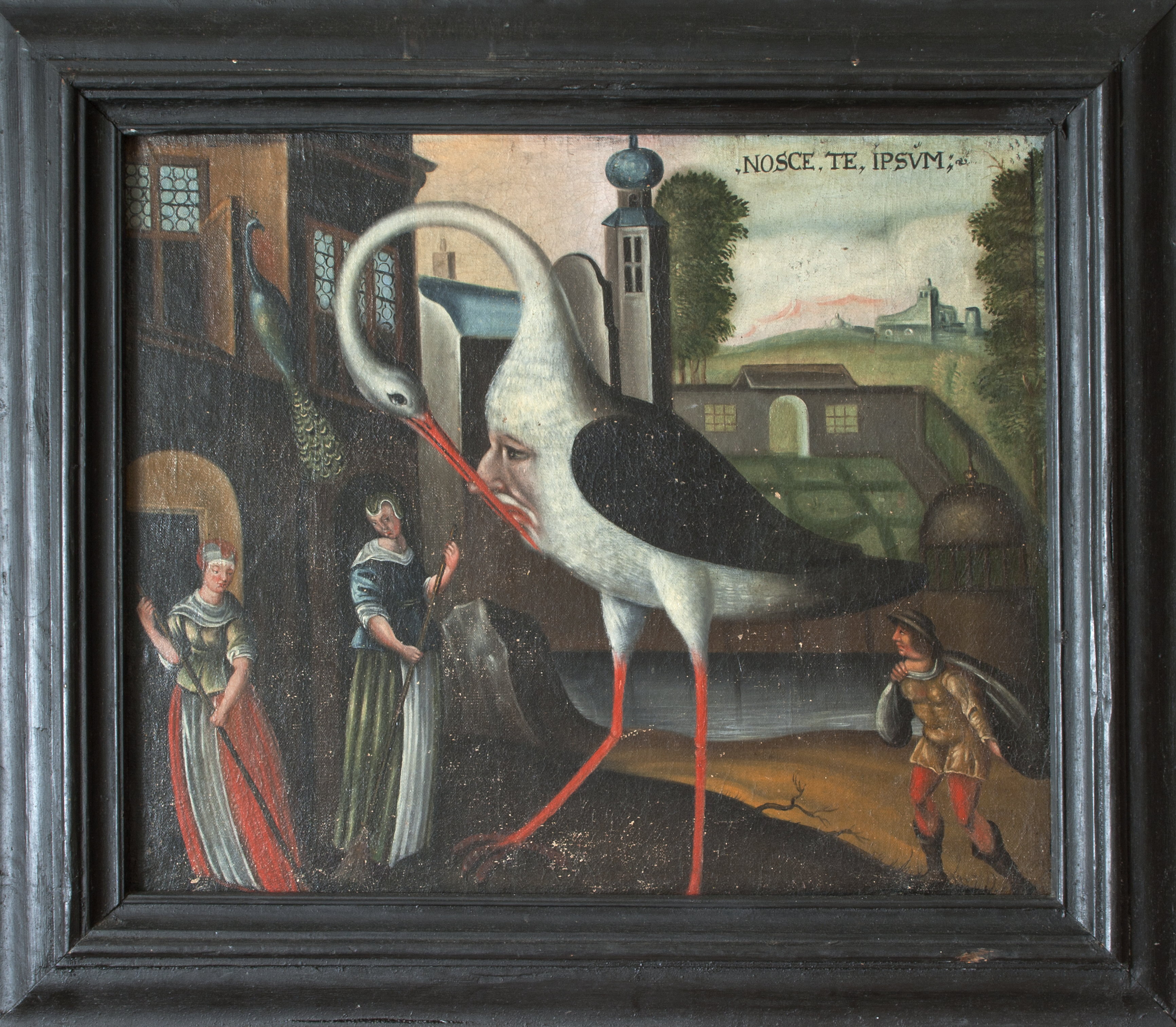 Oljemålning från 1600-talet på stork med ansikte på bröstet.