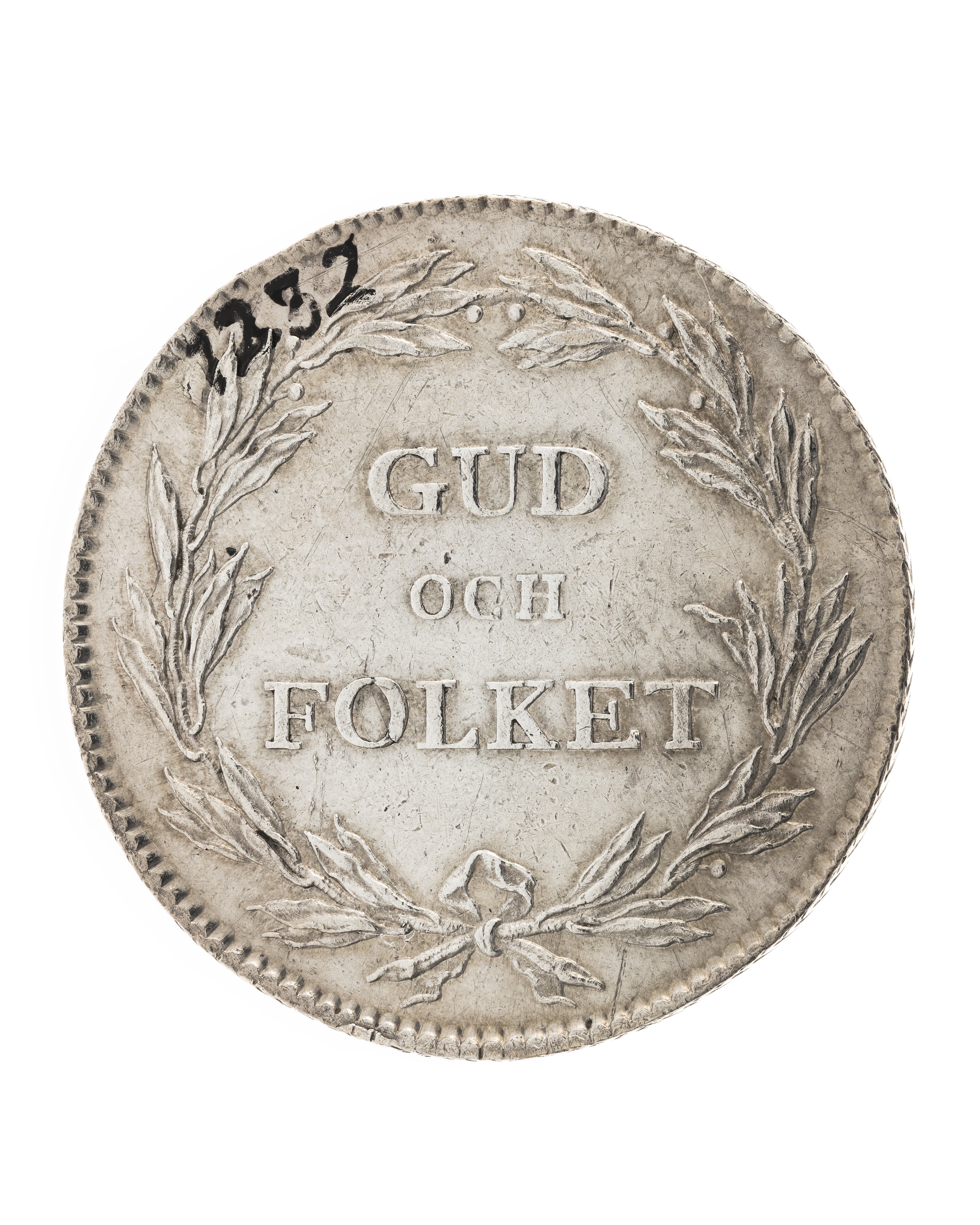 Kastpenning av silver från konung Gustav IV Adolfs kröning. Gud och folket.