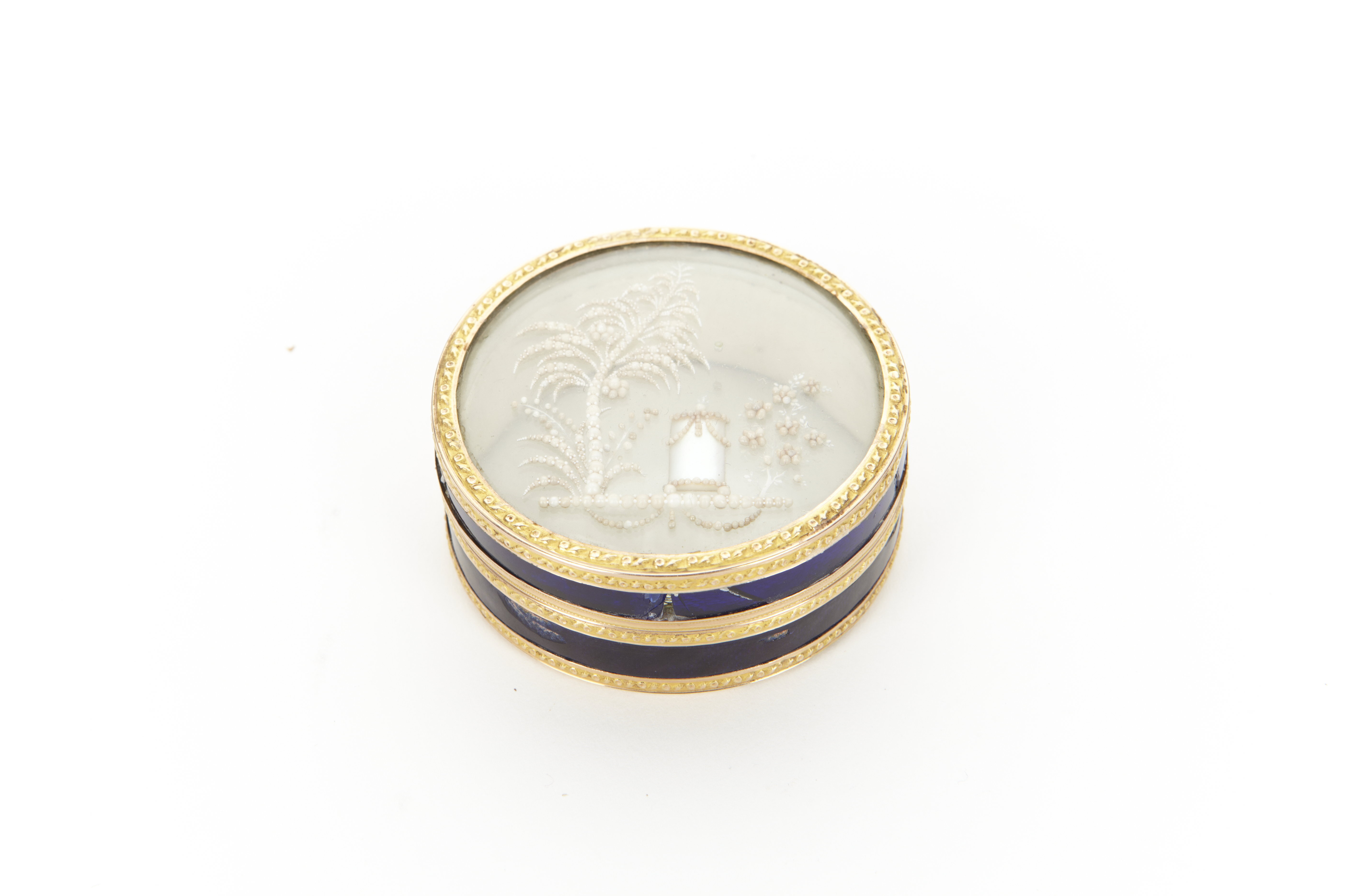 Rund dosa från 1800-talet med pärlor, glas, guld och emalj.