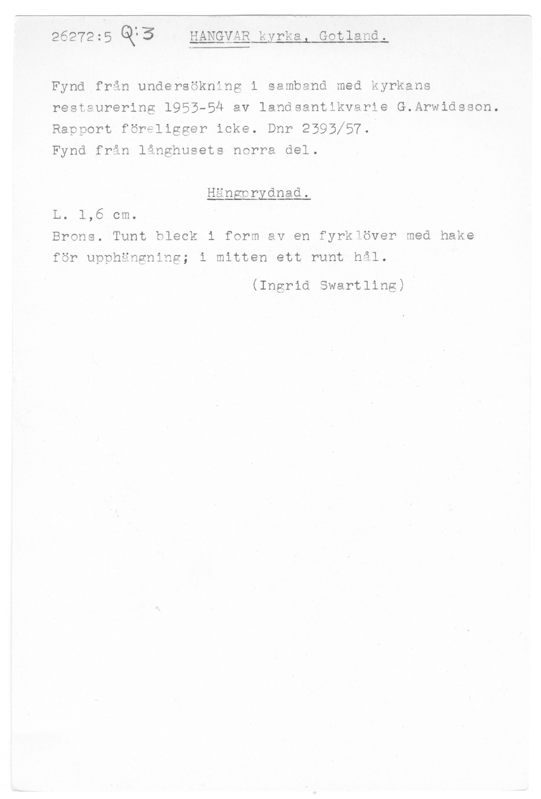 26272:5 \ Gotland \ Hangvar kyrka, Gotland. \ Hängprydnad \ Medeltid