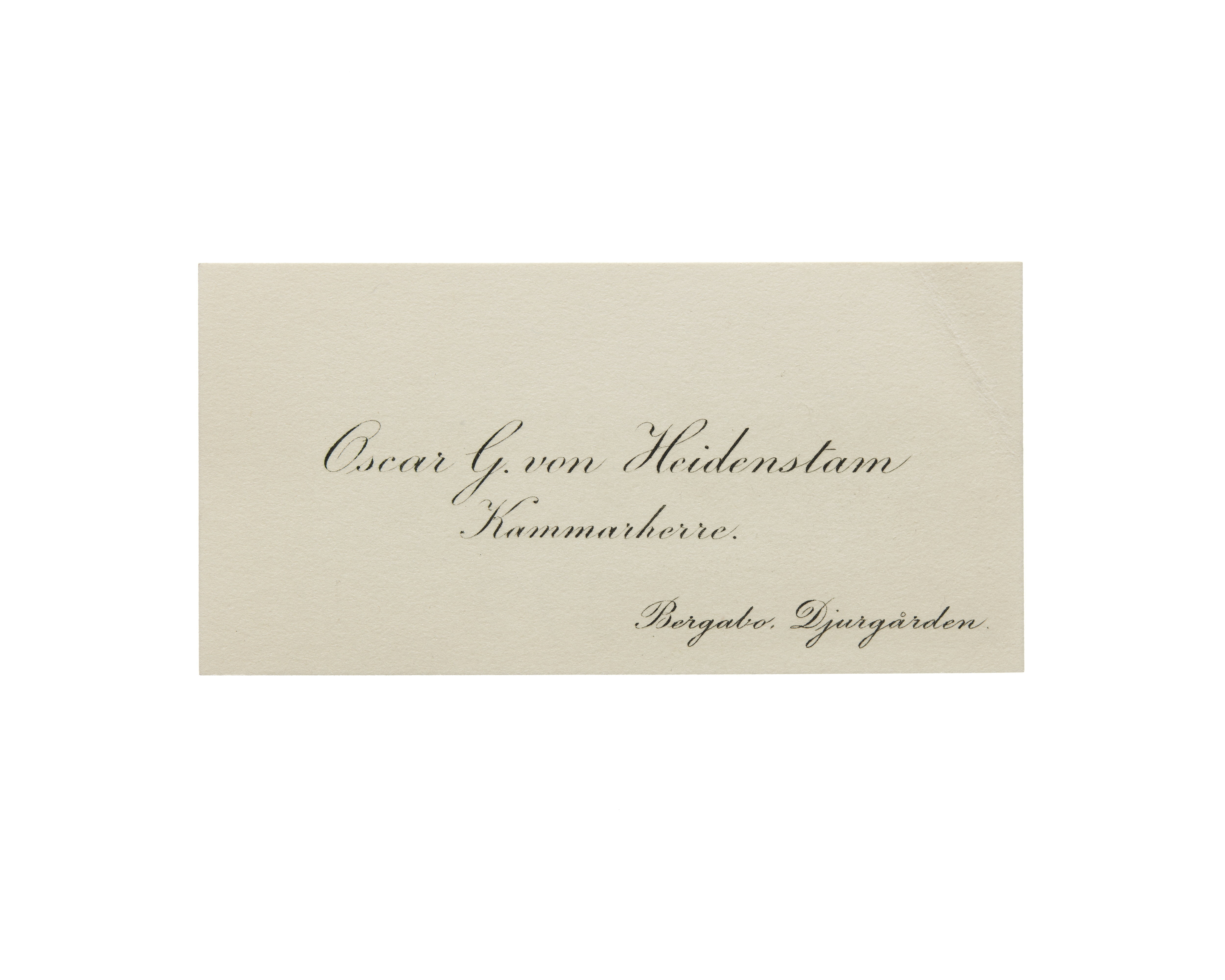 Visitkort från Oscar G. von Heidenstam, Kammarherre. Bergabo, Djurgården.