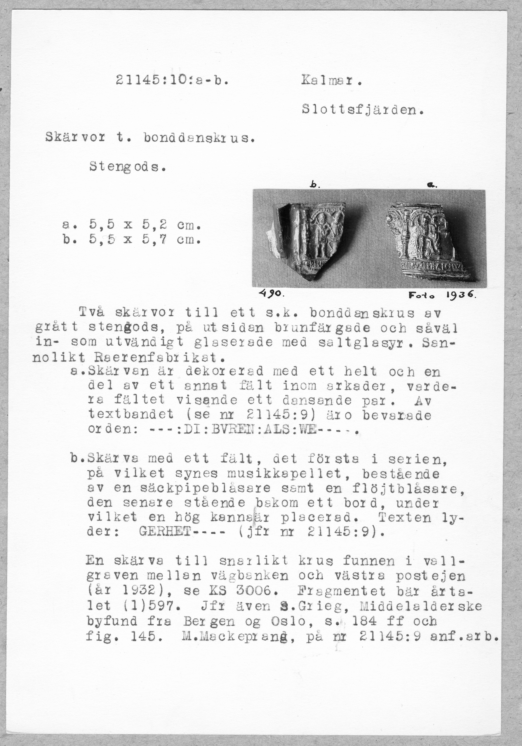 21145:10:a-b. Kalmar. Slottsfjärden. Skärvor t. bonddanskrus. Stengods