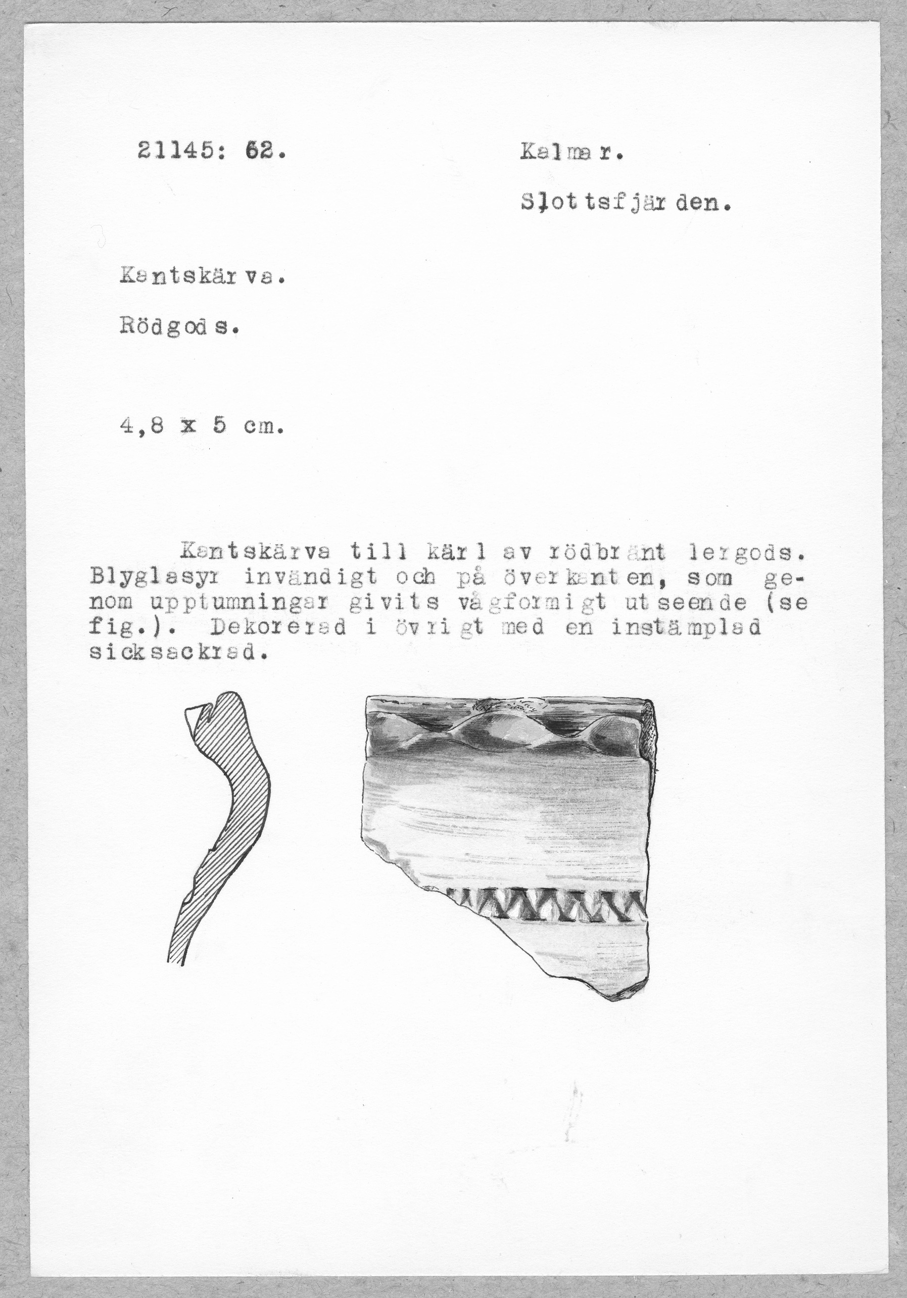 21145:62. Kalmar. Slottsfjärden. Kantskärva. Rödgods