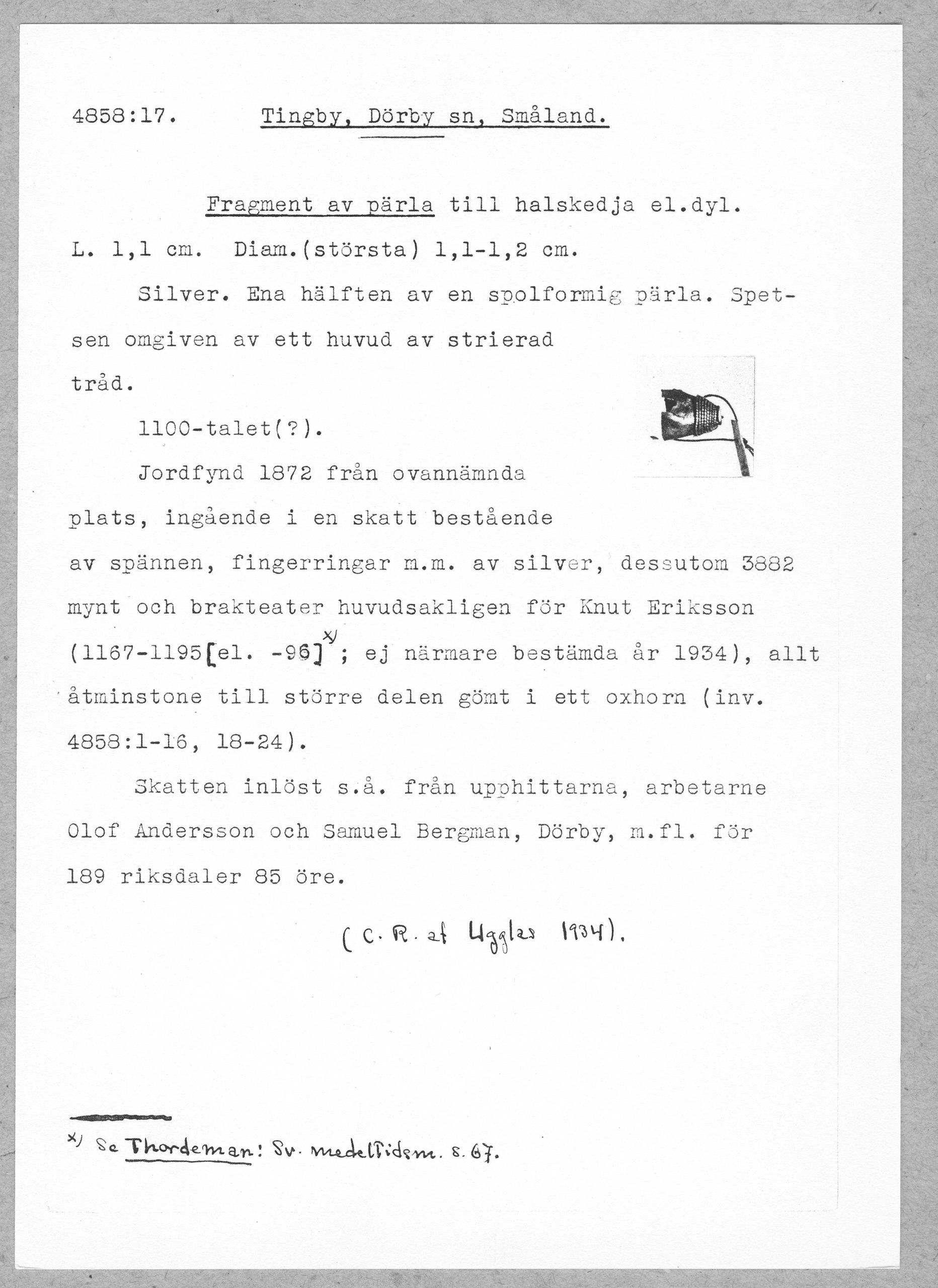 4858:17 \ Småland \ Tingby, Dörby sn, Småland. \ Fragment av pärla \ Medeltid