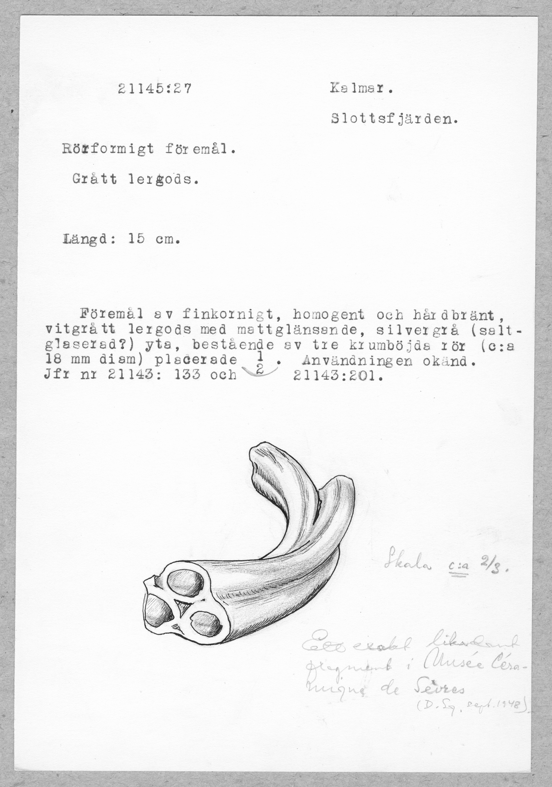 21145:27. Kalmar. Slottsfjärden. Rörformigt föremål. Grått lergods
