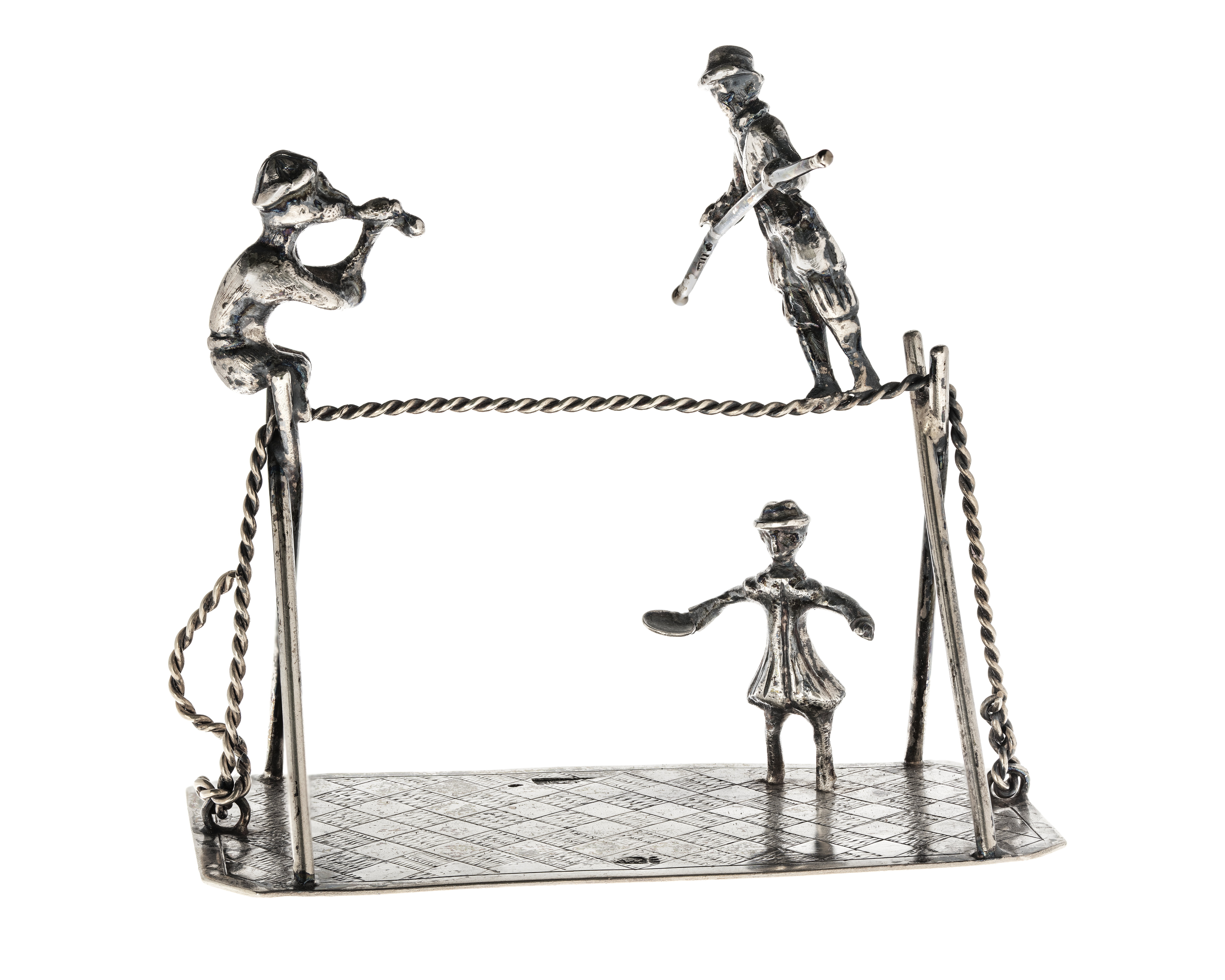Lindansare med apa och figur med penningtallrik. 1850-tal.