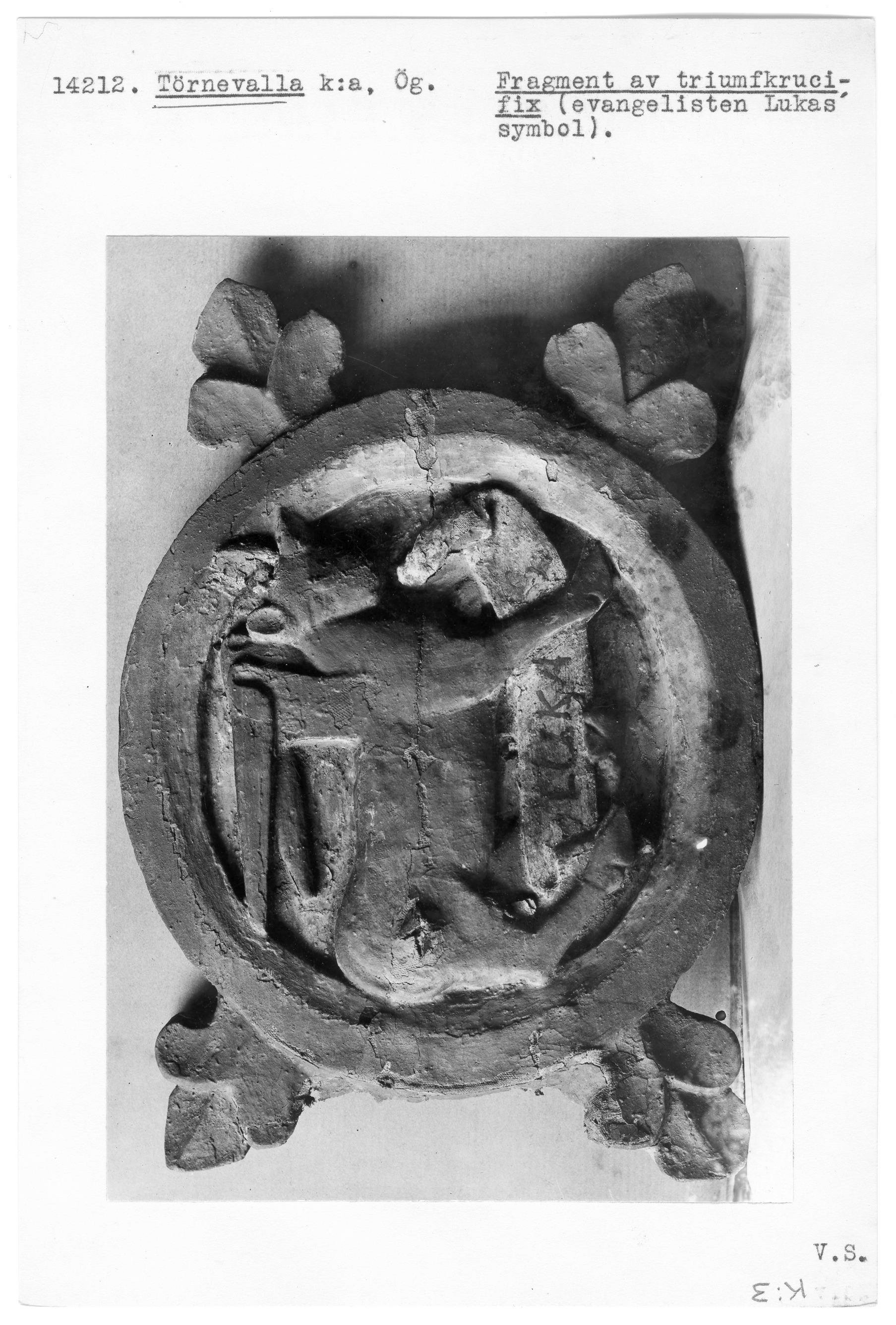 14212: \ Östergötland \ Törnevalla k:a, Ög. \ Fragment av triumfkrucifix (evangelisten Lukas´ symbol) \ Medeltid