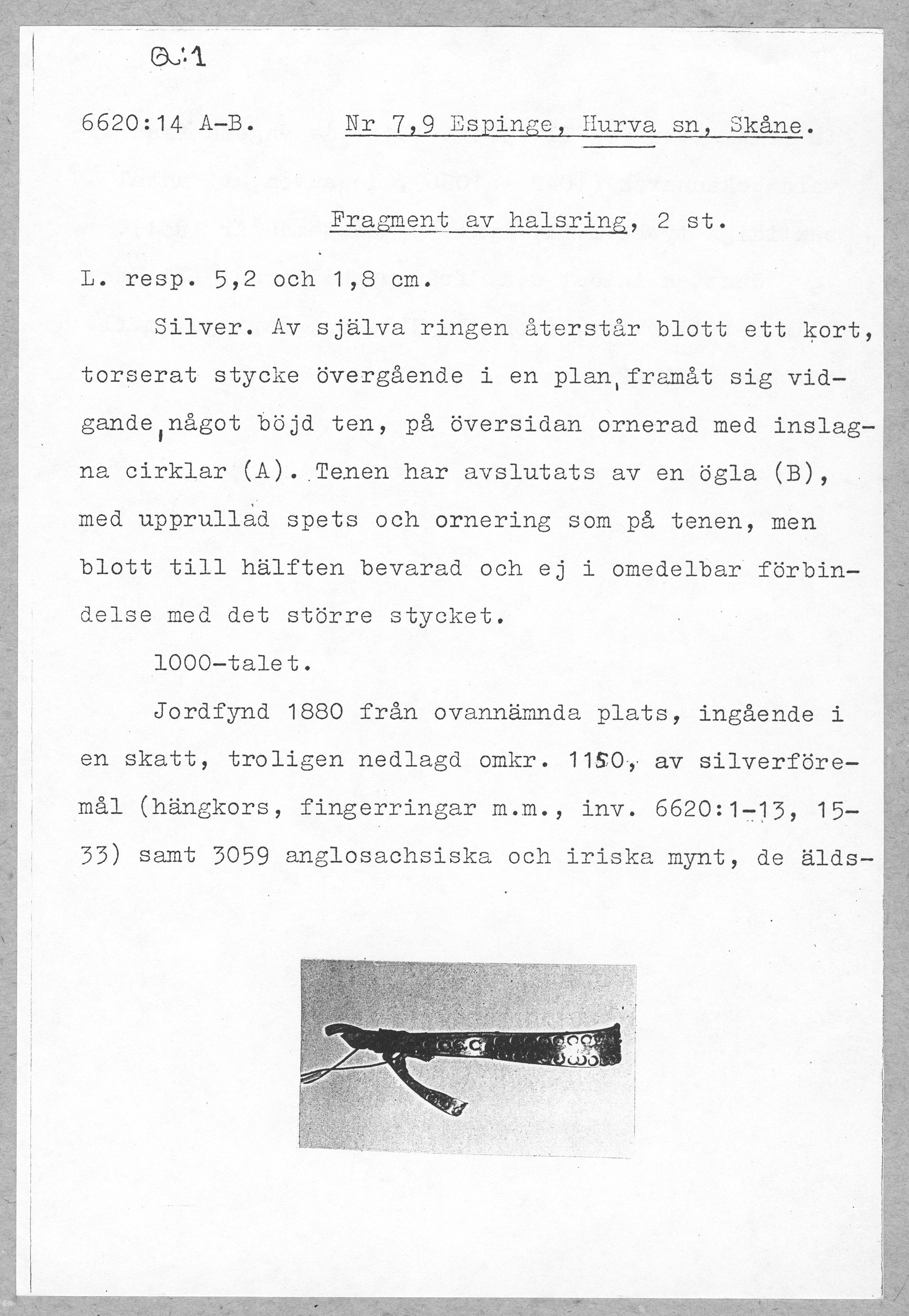 6620:14 A-B \ Skåne \ Nr 7,9 Espinge, Hurva sn, Skåne. \ Fragment av halsring \ Medeltid