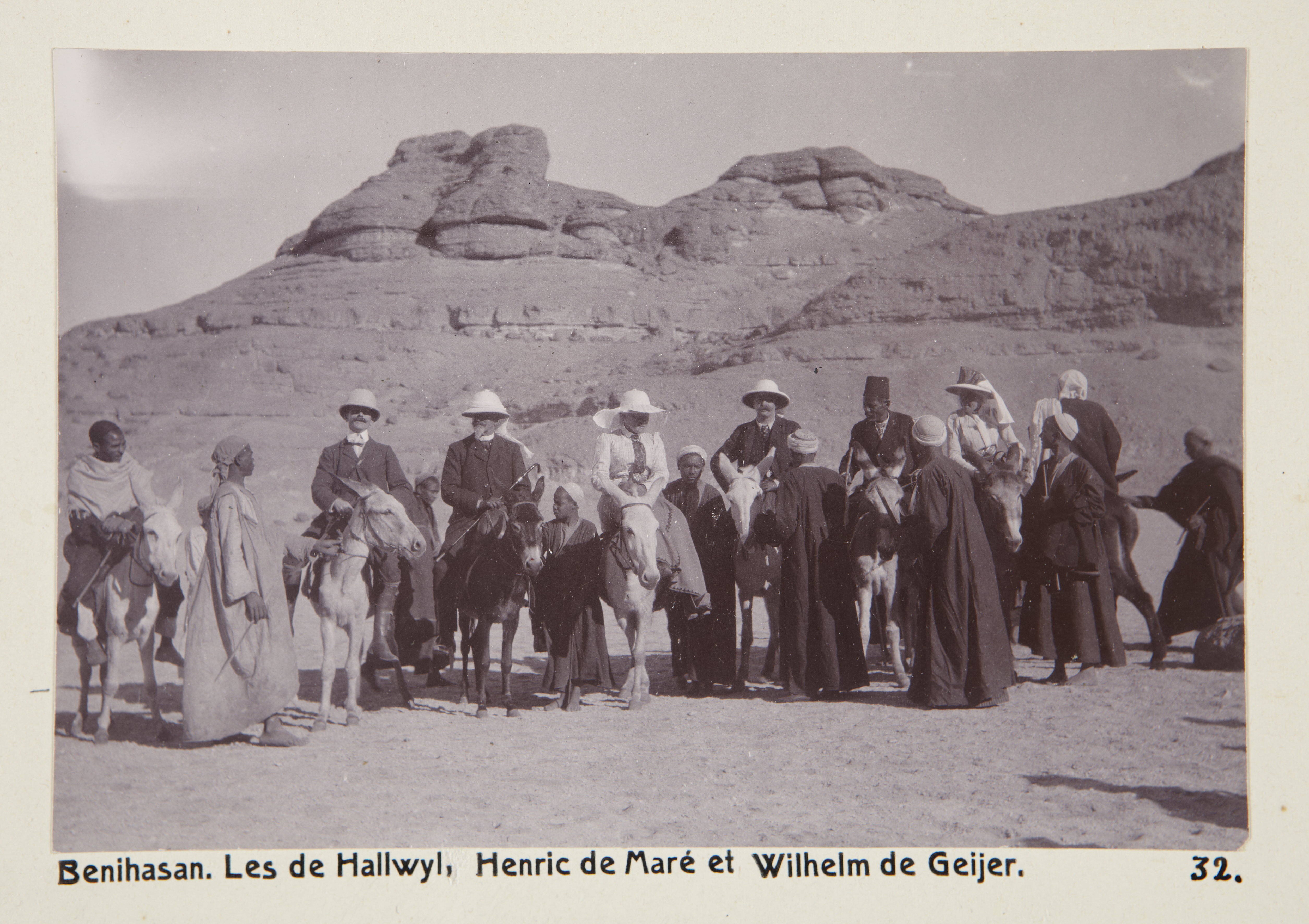 Fotografi från familjen von Hallwyls resa genom Egypten och Sudan, 5 november 1900 – 29 mars 1901. Familjen von Hallwyl, Henric de Maré och Wilhelm von Geijer på åsnor, på väg till Beni Hasan.