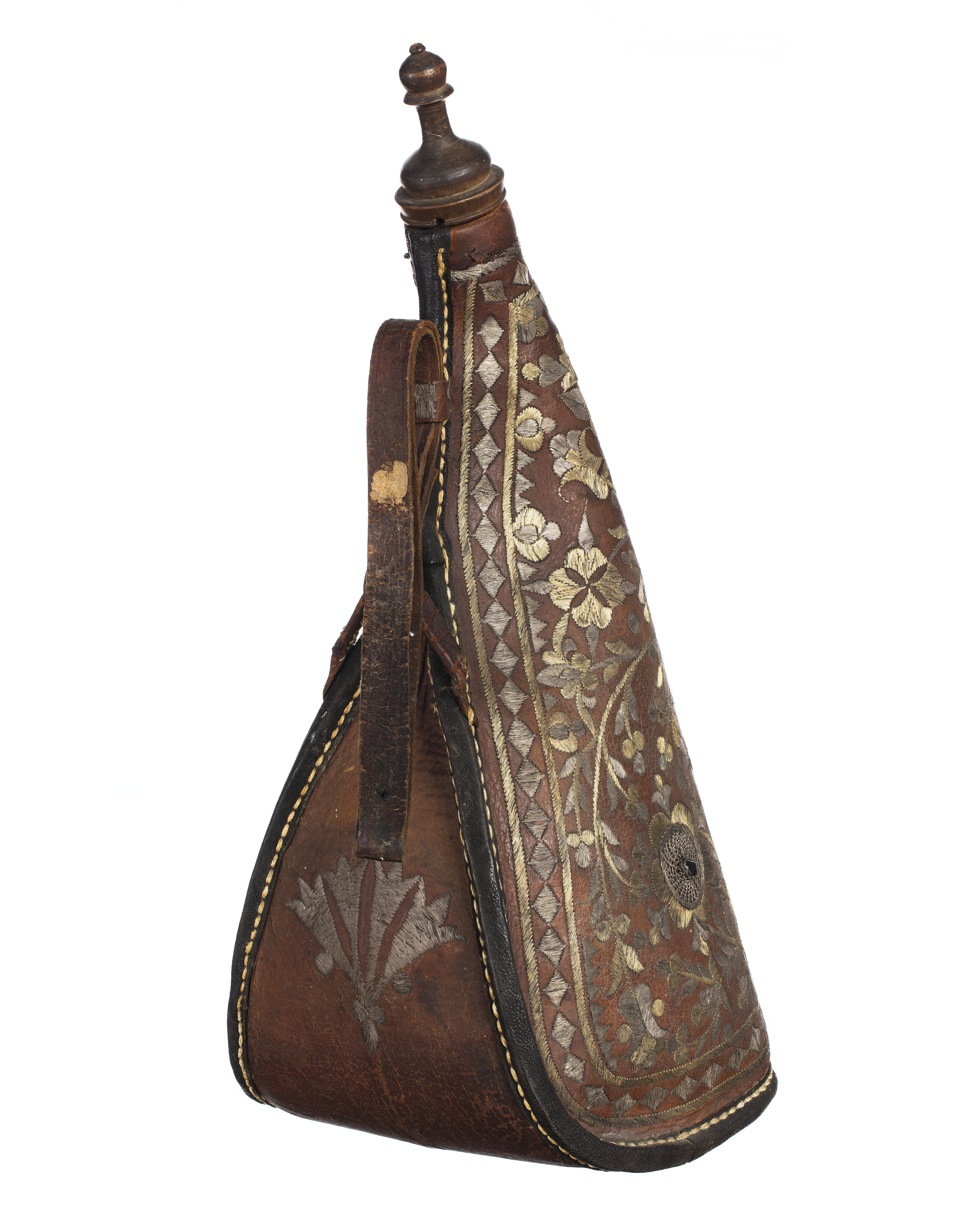 Flaska av läder med yttäckande ornering av med guld- och silvertråd broderade blommor och bladrankor.
