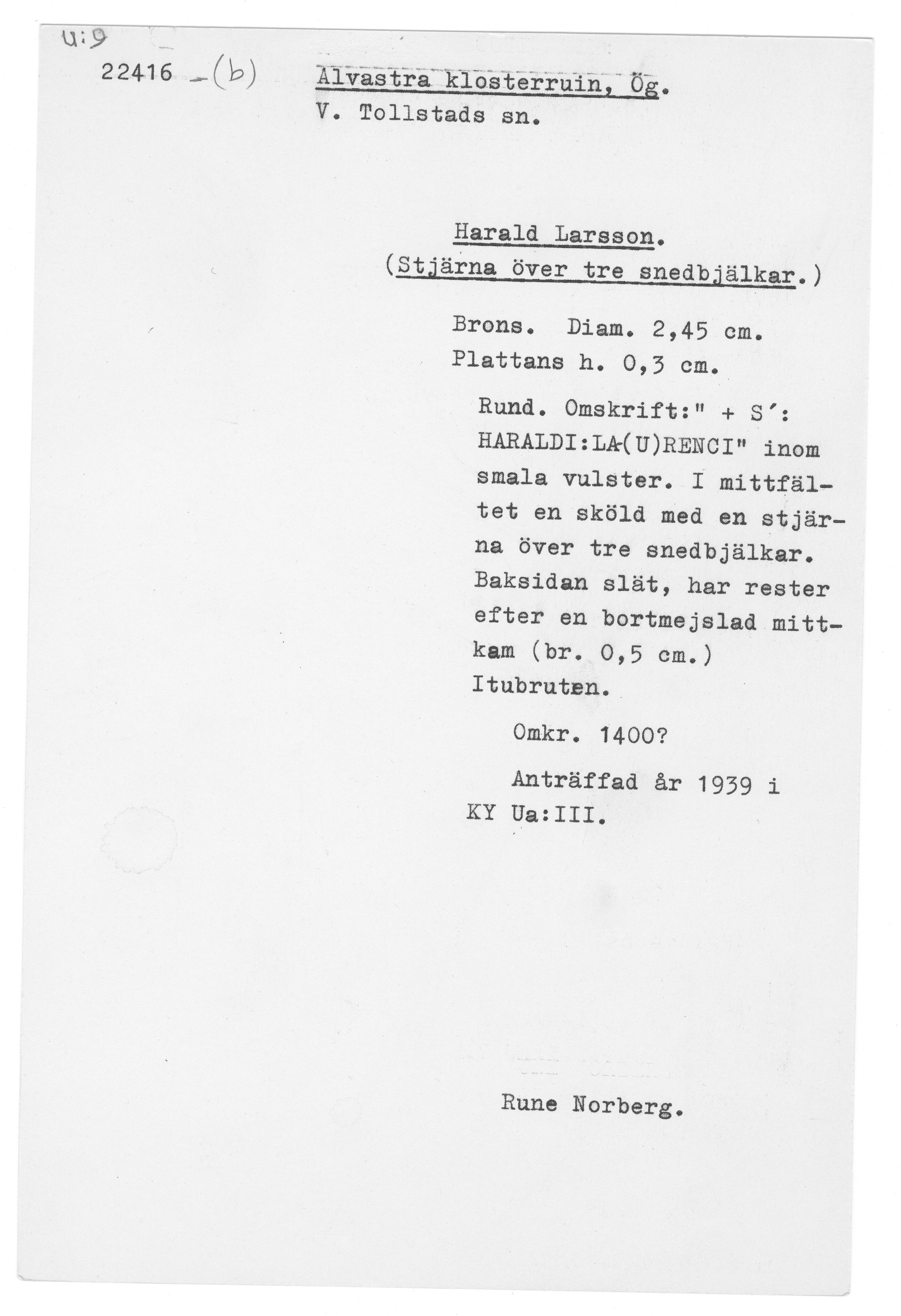 22416: \ Östergötland \ Alvastra klosterruin, Ög \ Harald Larsson. (Stjärna över tre snedbjälkar.) \ Medeltid