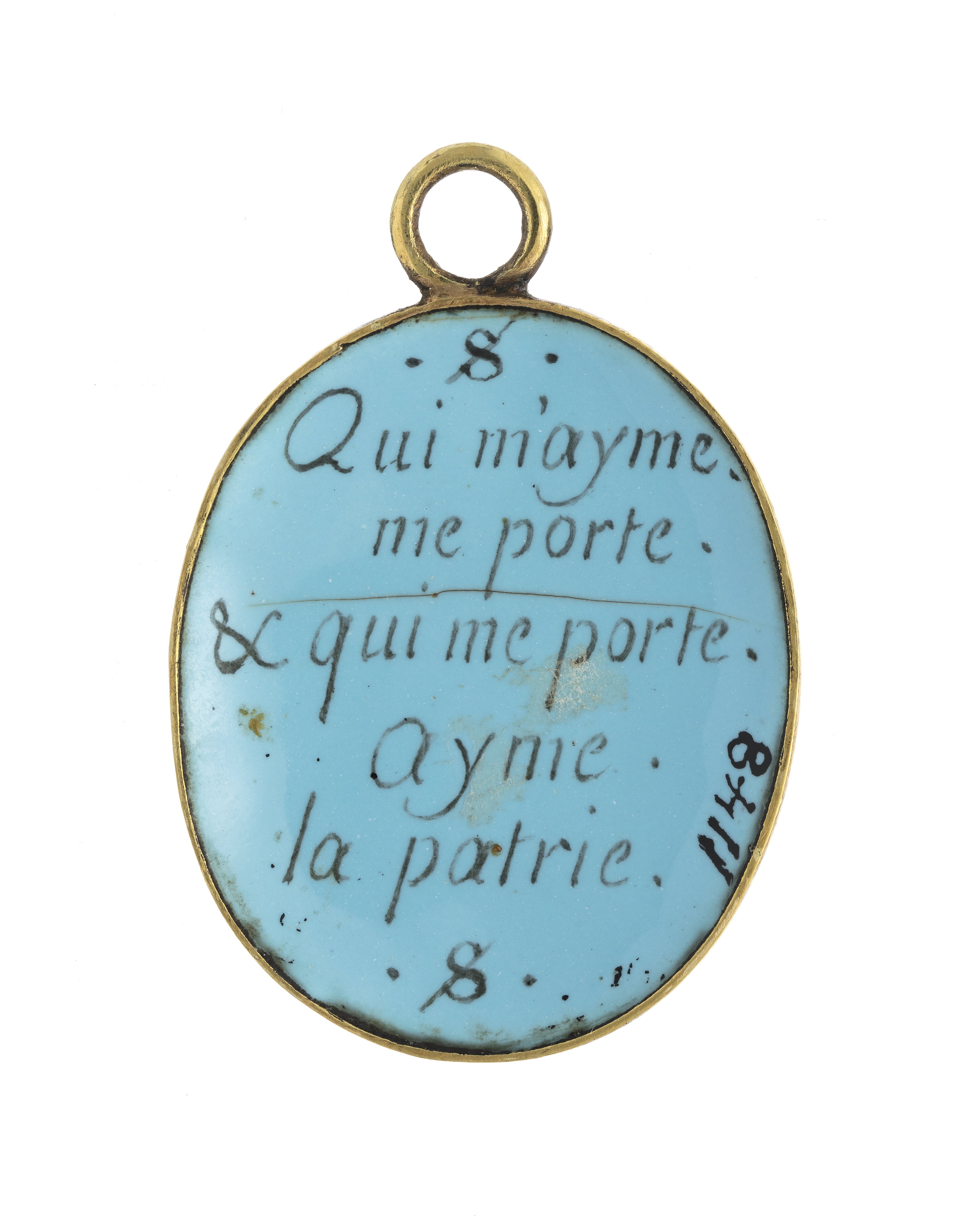 Emaljerad baksida med text, 1670 cirka. Qui m'ayme me porte och qui me porte Ayme la patrie.
