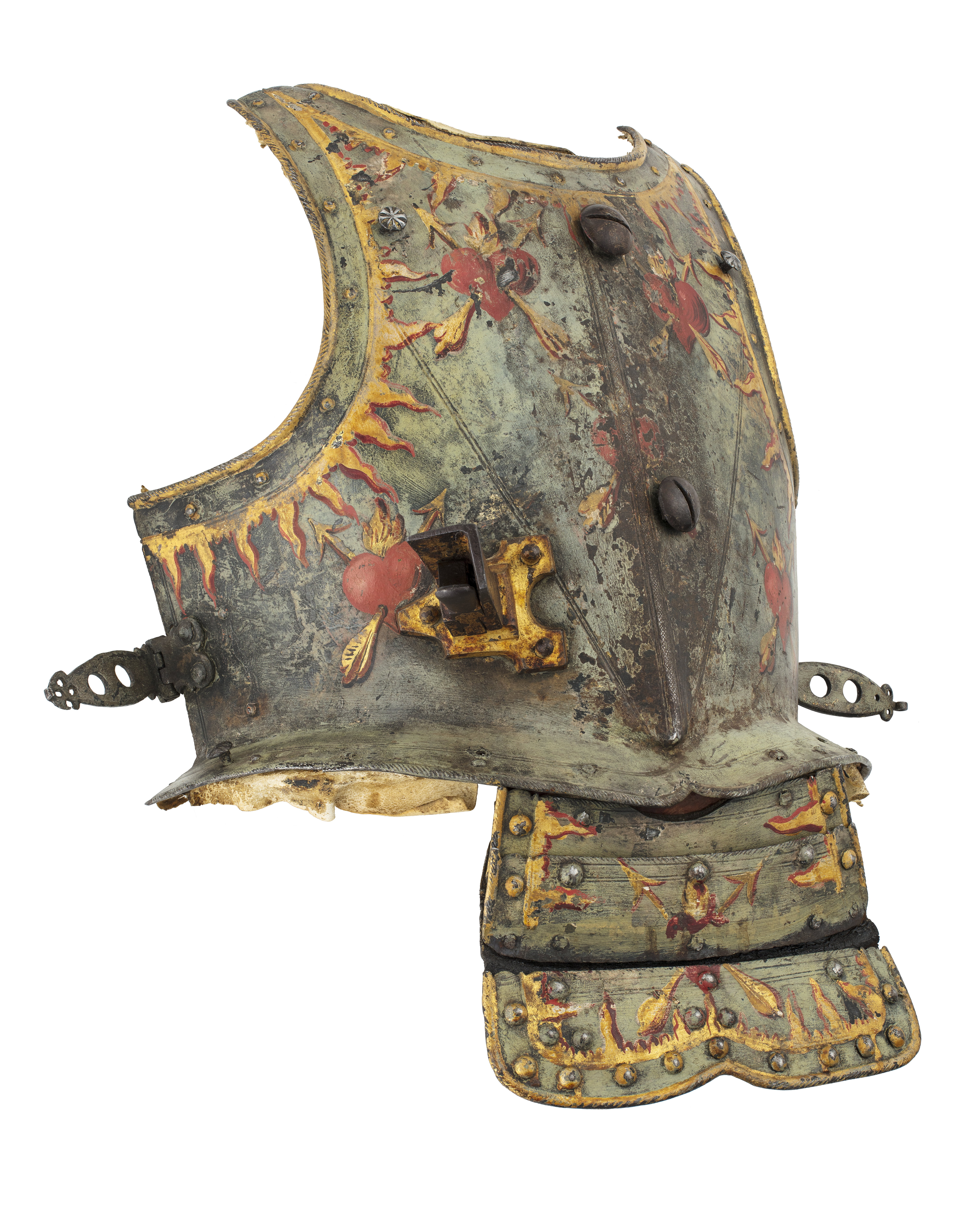 Bröstharnesk av stål med målade hjärtan och eldflammor.