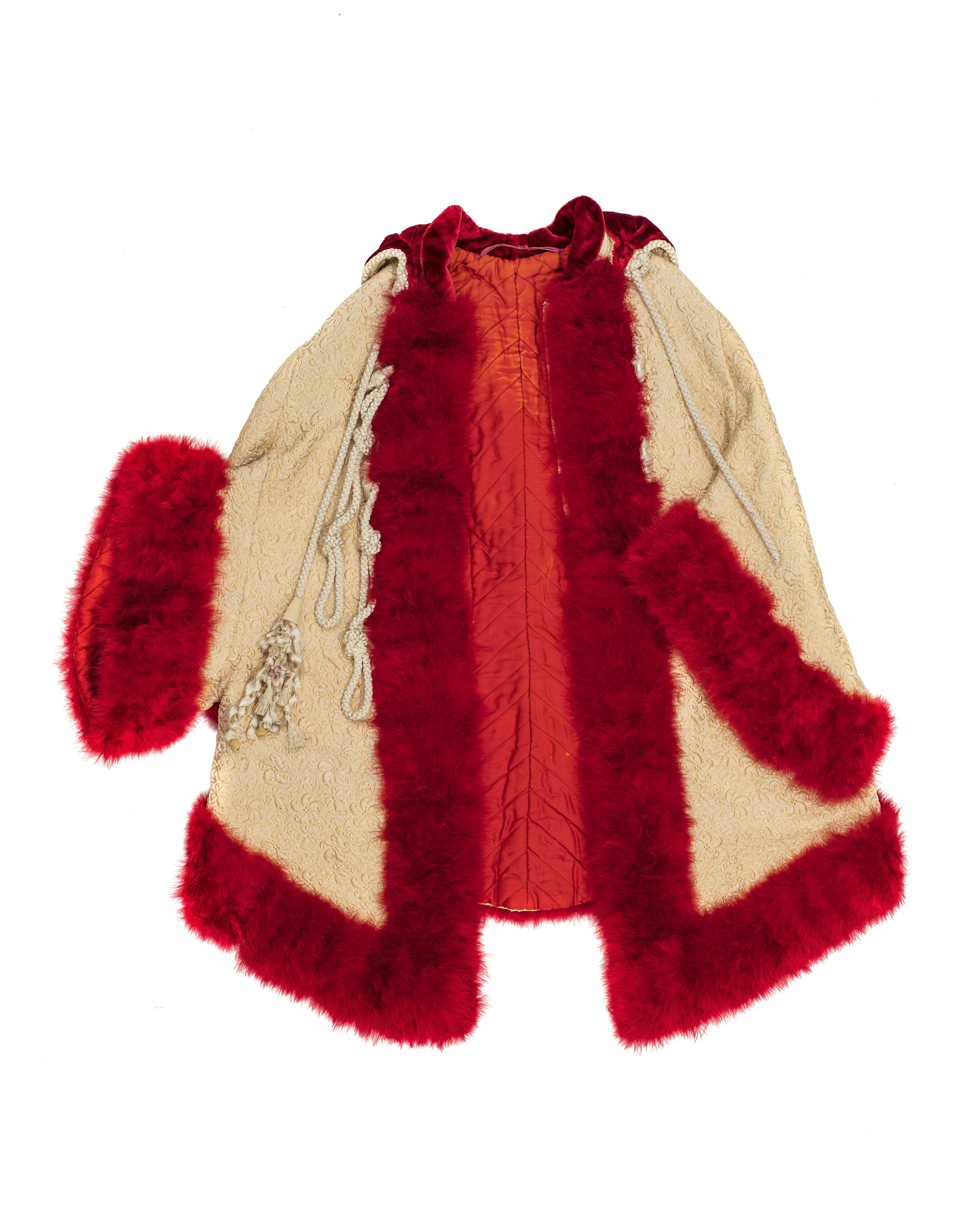 Burnus av mönstrat vitt siden, matelassé-imitation med röd fjäderbräm, silke-kordonger och tofsar, 1887 cirka.