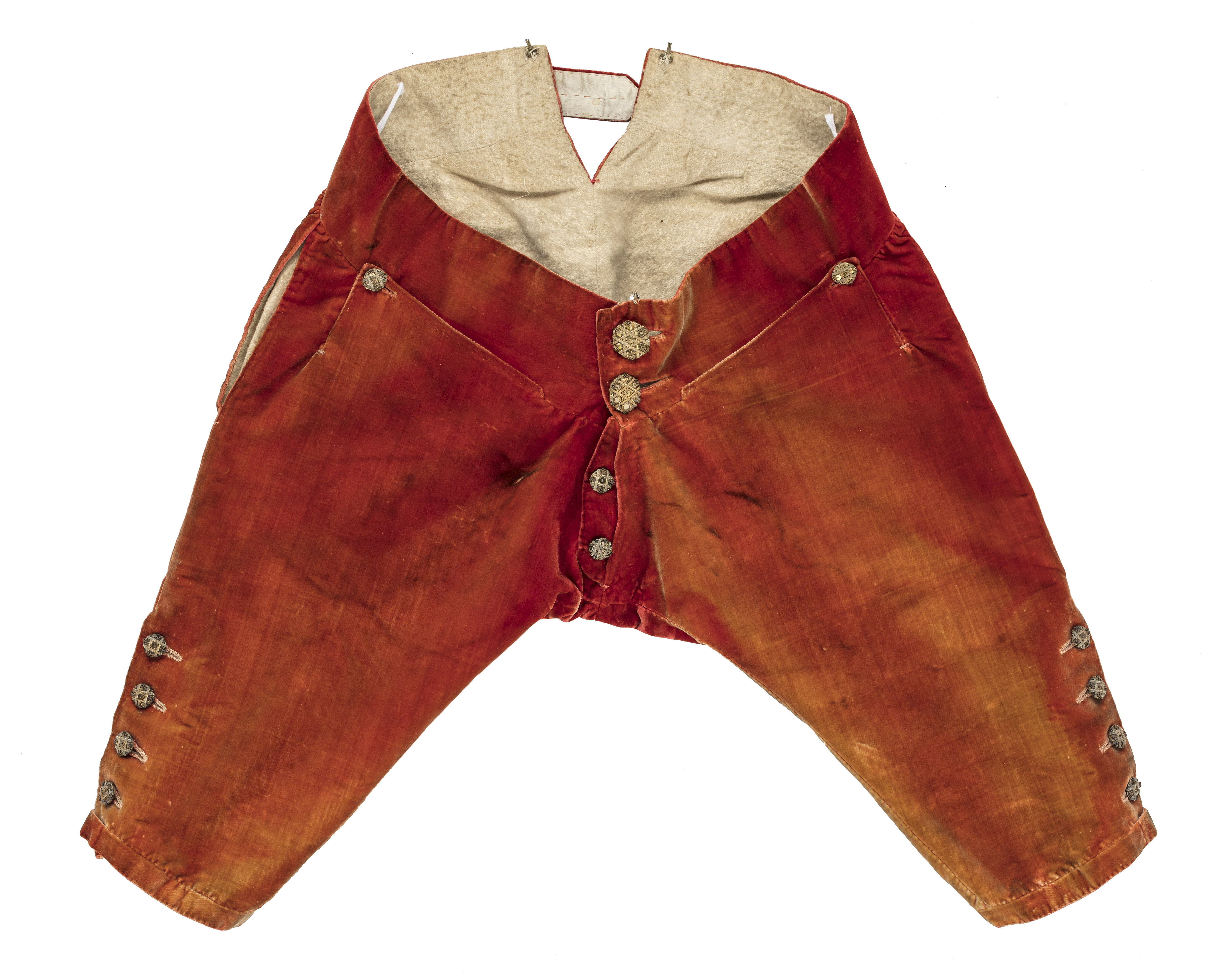 Byxor i röd sammet hörande till Adolf Fredriks serafimerdräkt, 1750-tal.