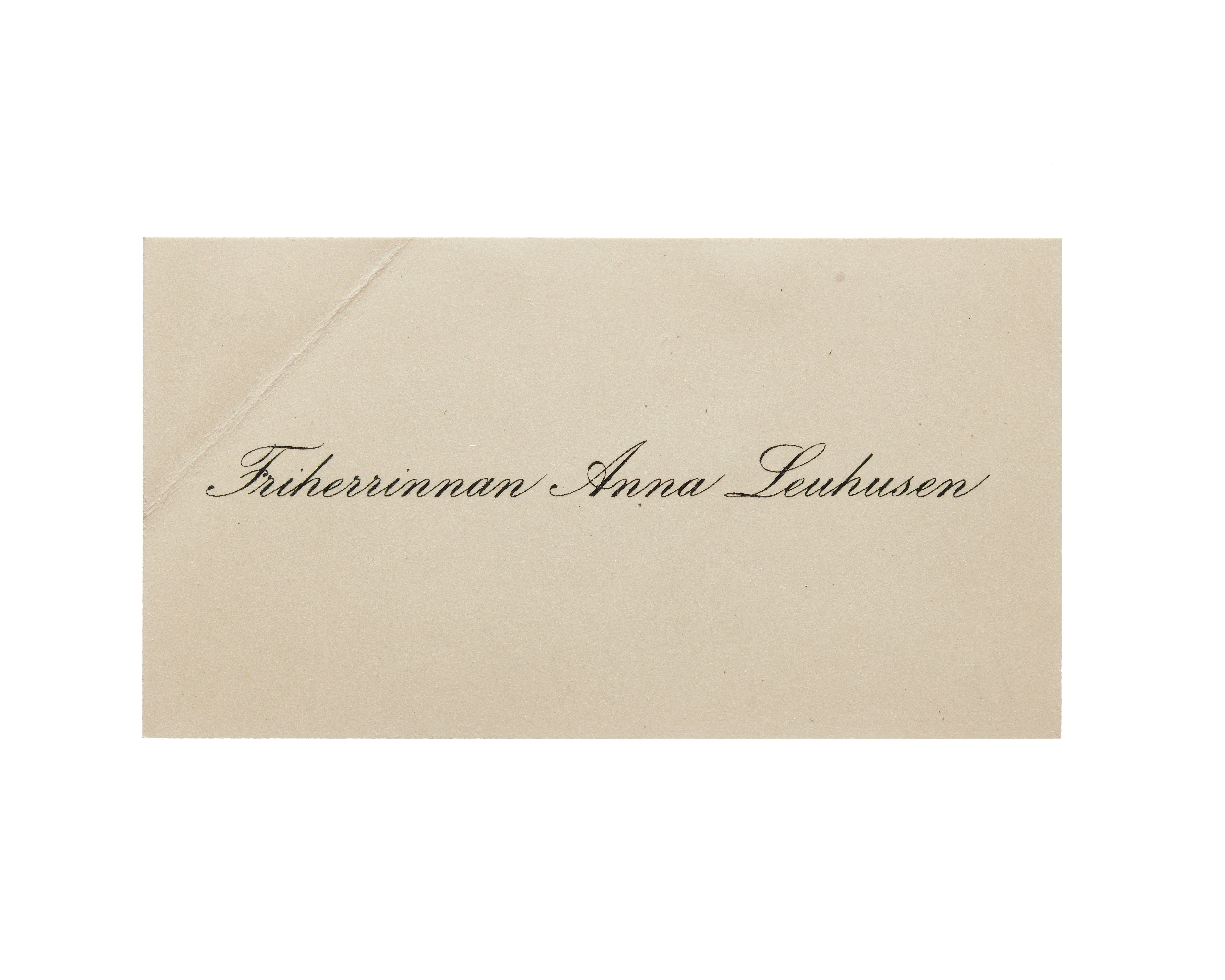 Visitkort från Friherrinnan Anna Leuhusen. Med handskrift.