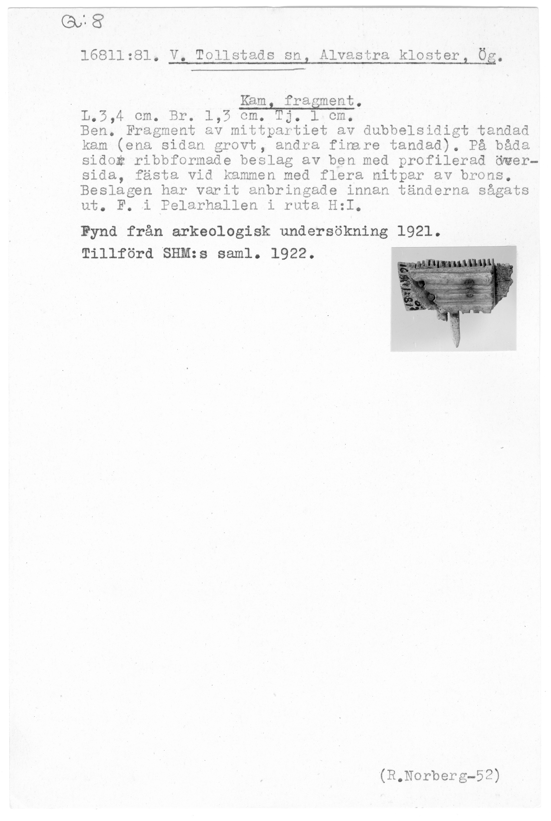 16811:81 \ Östergötland \ V. Tollstads sn, Alvastra kloster, Ög. \ Kam, fragment \ Medeltid