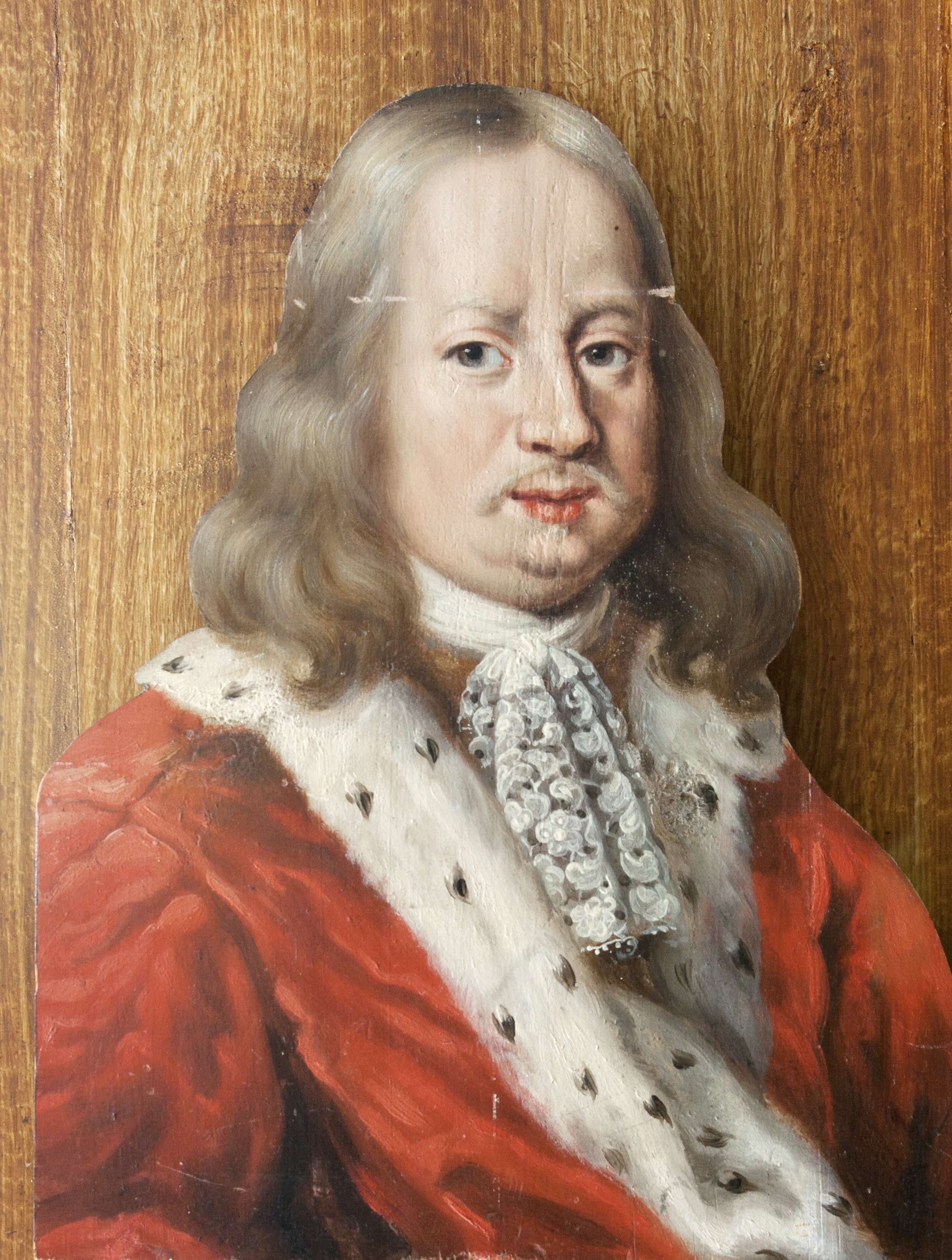 Per Brahe d.y. greve och riksråd 1602-1680. Oljemålning på kontursågad furupannå från cirka 1700.