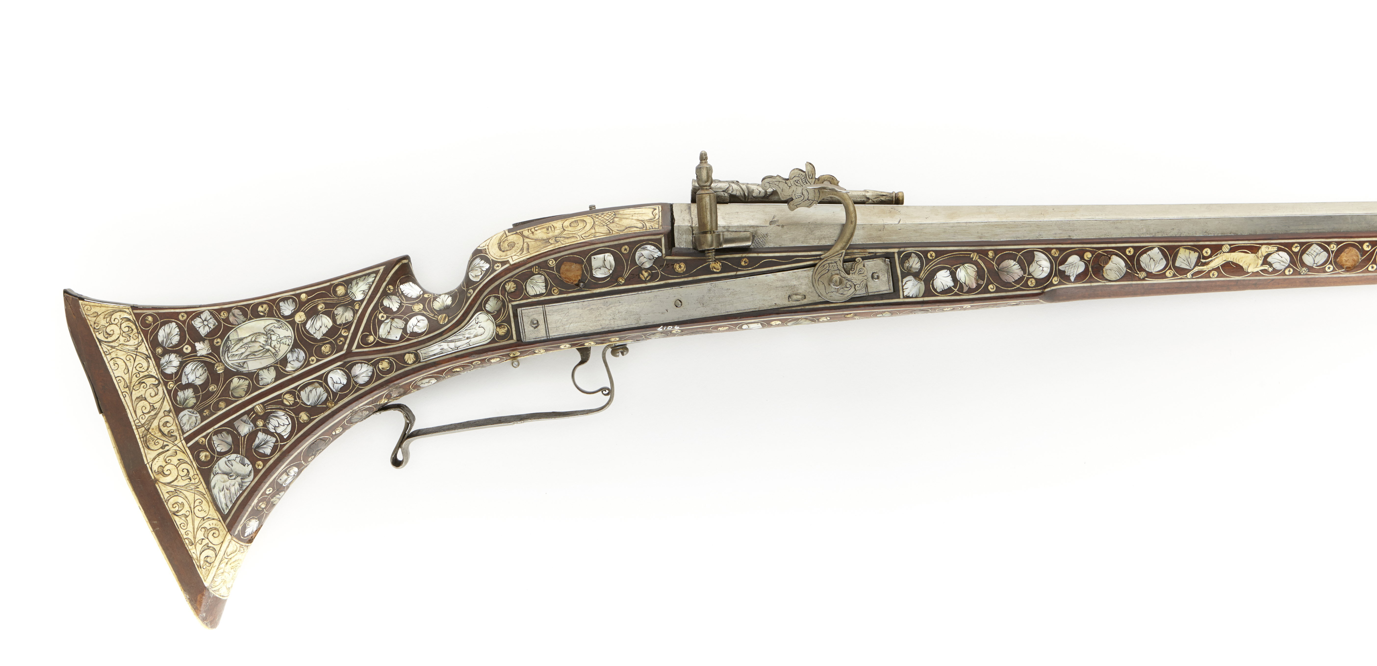 Pärlemor dekorerad luntlåsmusköt, 1600-1620 cirka.