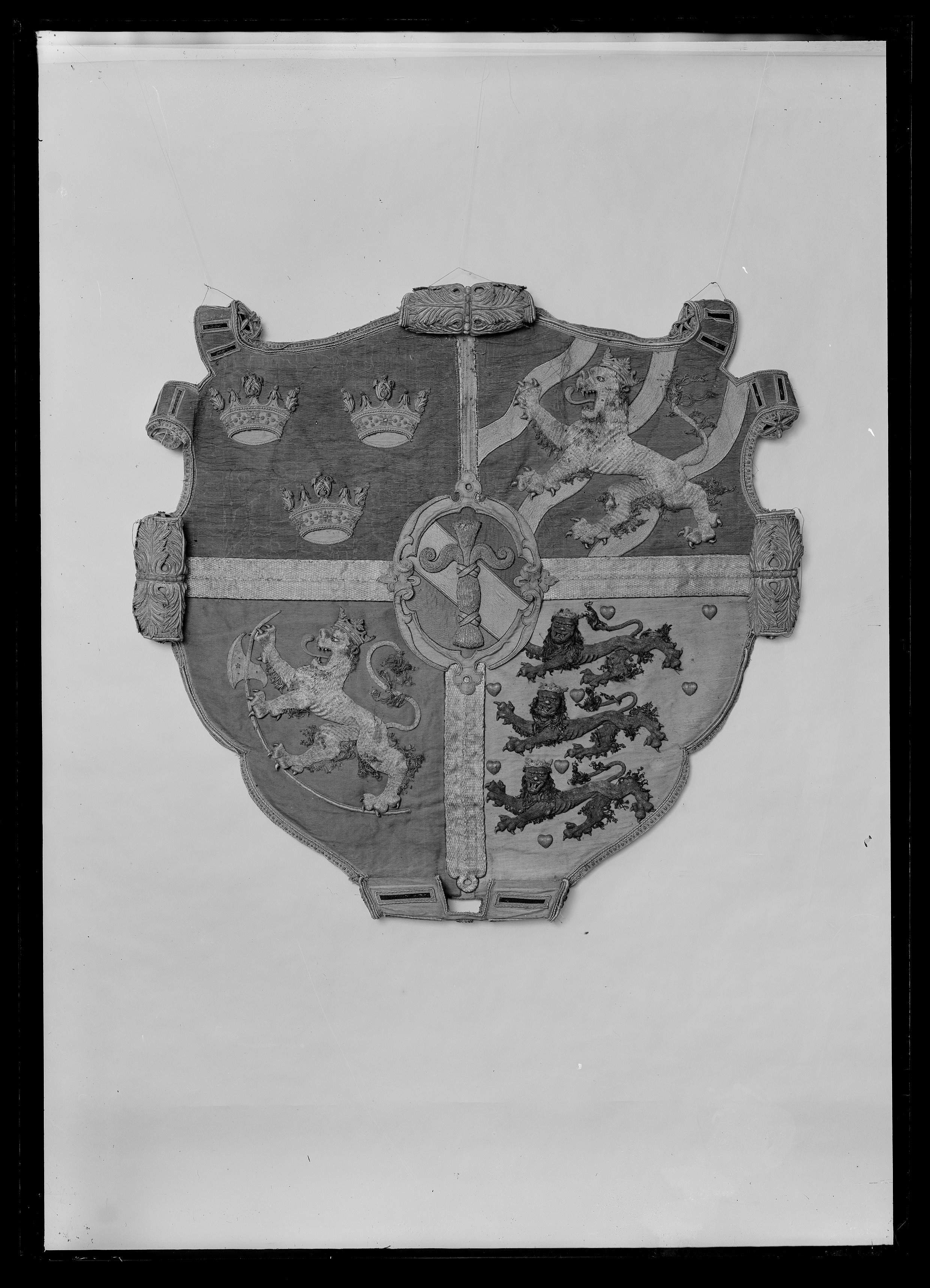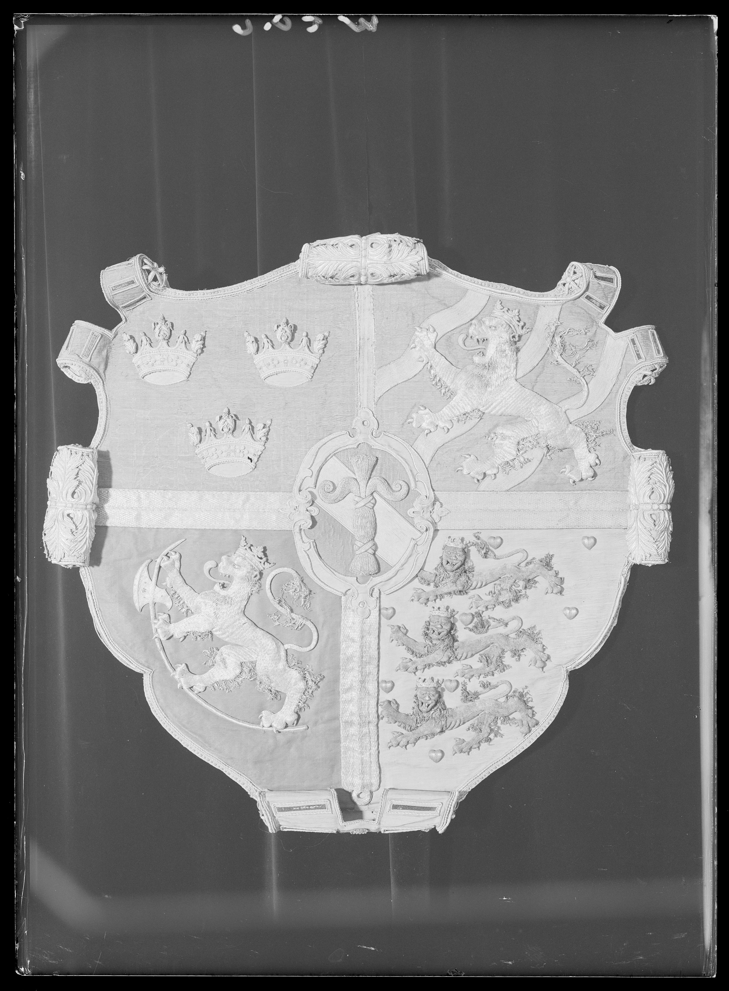 Vapnet är troligen ett arbete från Hubert Woldemarssons ateljé, beställt av Erik XIV till kröningen 1562. Enligt Carl Anton Ossbahr funnet oavslutat i Woldemarssons dödsbo tillsammans med krona och bokstäver E R och C R, alltså avsett för Karin Månsdotters kröning. Kvadrerad vapensköld med en ram, 18 mm bred, av guldtråd och stygn av röd silkestråd. Ramen består av guldsnören i olika tjocklek samt små prickar av kantiljer av silvertråd. På ramen sitter fyra upphöjda kartuscher av guldtråd varav tre kartuscher föreställer akantusblad sammanbundna med ett band av spolformer i silvertråd medan den nedersta kartuschen är slät med en smaragd av grön silkestråd och smala rektanglar ifyllda med svart silkestråd. På ramens övre del ytterligare fyra mindre kartuscher av blått siden. Ett guldkors broderat i relief av guldtråd med i mitten utstående åsar, kvadrerar vapnet. Samtliga kartuscher har i ändarna en påsydd broderad guldstjärna. De två övre fälten framställer Sveriges vapen mot ett bottentyg av blått kypertvävt siden, till vänster tre kronor och till höger Sveriges lejon. Kronorna är öppna, broderade med en guldtrådsbotten och en kronring av guldsnöre samt stiliserade ståndare med akantusblad. På kronringen samt på ståndarna, silverkantiljer och röd silkestråd föreställande rubiner. Kronorna är 110 x 120 mm stora. Det svenska lejonet är broderat av guldtråd i relief på en botten av silkeskärna. Man och hårbeklädnad är av nedsydd trasslad guldtråd. Tänderna är av vitt, vaxat linne. Ögonen är av vit silkestråd och med en pupill av en brun glaspärla. Kronan på lejonets huvud är av guldtråd med stiliserade ståndare med blad och silverkantiljer. Bakom lejonet, är broderat tre vågor av vit silkestråd och silvertråd, kantade med brun silkestråd. Kvadreringsrutan ned till vänster har ett bottentyg av rött kypertvävt siden med Norges vapen, ett lejon broderat av guldtråd i relief på silkeskärna. Man och hårbeklädnad är av nedsydd krusad guldtråd. Tänderna är av vitt, vaxat linne. Ögonen är av vit silkestråd och med en pupill av en brun glaspärla. Kronan på lejonets huvud är av guldtråd med stiliserade ståndare med blad och silverkantiljer. Lejonet står på en svängd hillebard av guldtråd fasthållen mellan framtassarna. Den nedre, högra kvadrerade rutan har ett bottentyg av gult kypertvävt siden med Danmarks vapen, tre leoperader. Leoparderna är broderade med blå silkestråd och silvertråd på en silkeskärna. Man och hårbeklädnader är av trasslad, nedsydd blå silkestråd. De bär guldkronor av guldtråd med stiliserade ståndare. Tänderna är av vit silkestråd och tungan är av ljust röd silkestråd. Gapet är kantat av ljust röd silkestråd. Ögonen är av vit silkestråd med ögonpupiller av små svarta glaspärlor. Runtom leoparderna är broderat åtta hjärtan av röd silkestråd och guldtråd. Mitt på vapenskölden är vasakärven broderad inom en stiliserad rund ram av gult siden kantad med guldsnören. Vasakärven är broderad i relief på silkeskärna mot en bakgrund av tre fält av rött, vitt och blått siden. Vapnet har ett dubbelt foder av beigefärgat linne. Vid varje kartusch är fastsytt bruna blommönstrade band, vävda av silkestråd med vågformiga kanter. Vapnet är fastspänt på en bottenplatta av trä.