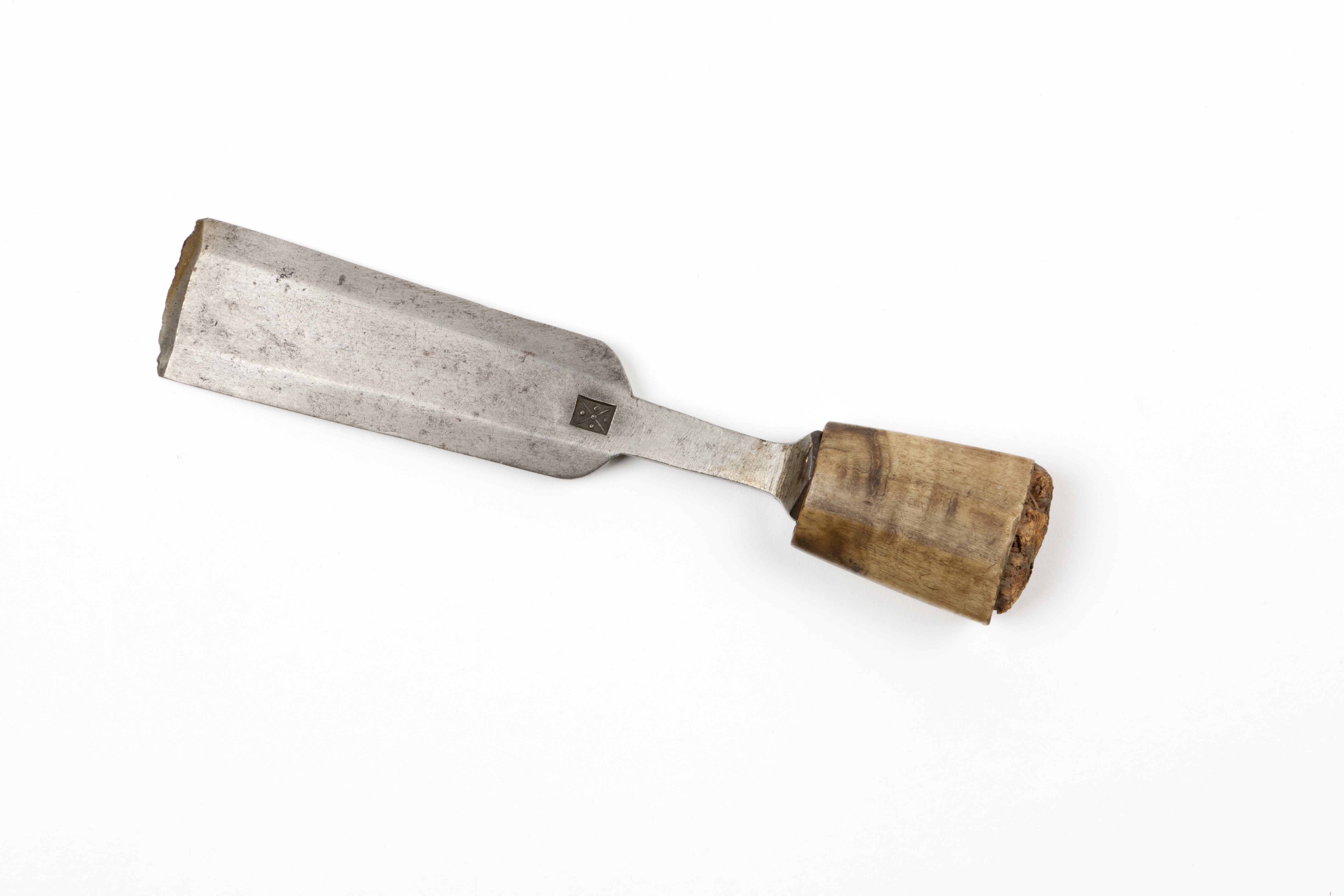 Bildhuggarjärn: stämjärn. Platt stål med en tresidig ovansida och en fyrsidig klinga. Rak egg, slipad från ovansidan. Vidgad bas. Skaft av lövträ. Hornring. Stämplat på stålet: en rektangel korsad av två diagonaler, en punkt i varje sålunda uppkommen triangel.
