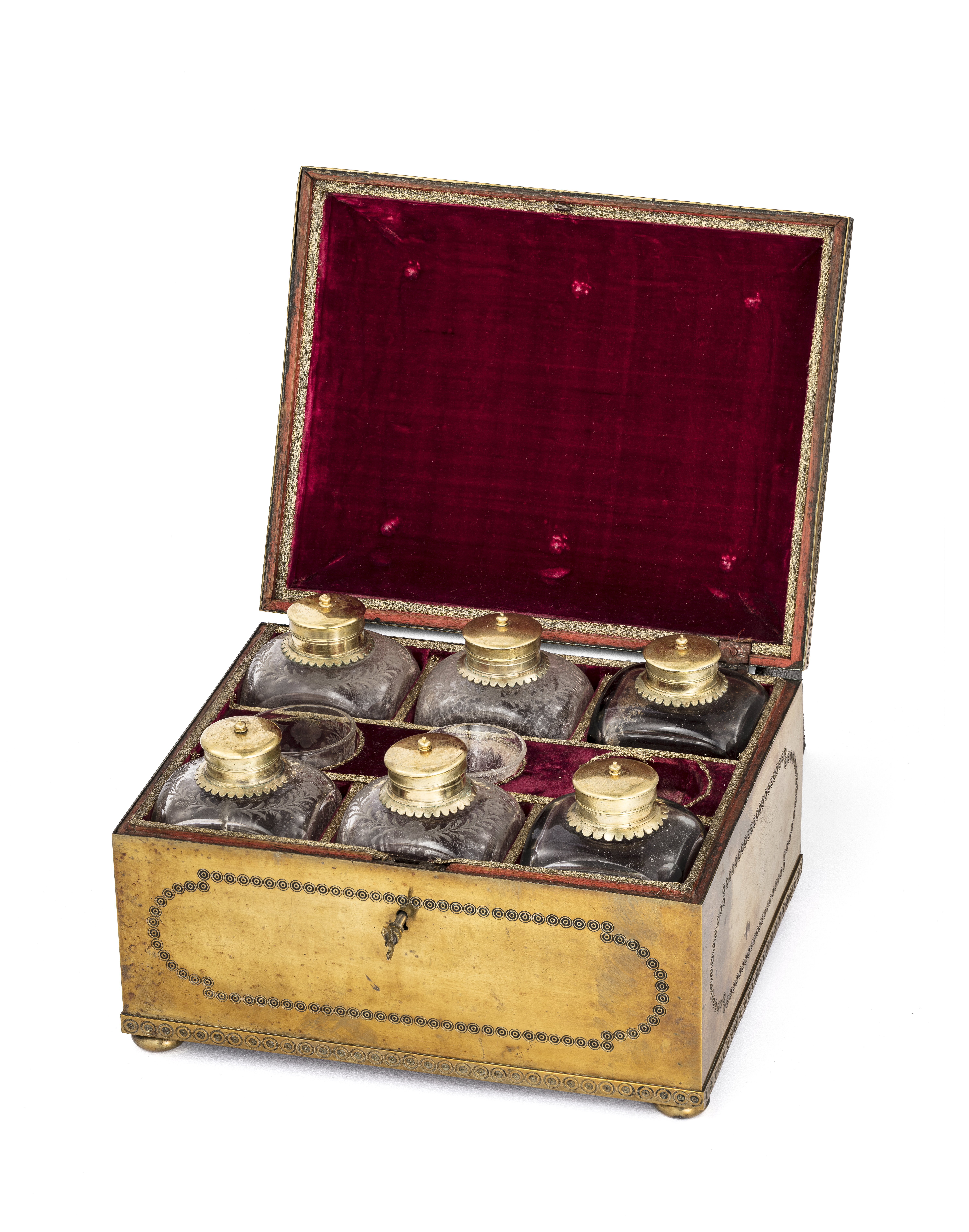 Flaska av glas med rektangulärt tvärsnitt och halsbeslag och lock av förgylld mässing. Glaset ofärgat och med en mycket svag grå ton. Sidorna, bottnen och de fasade hörnen planslipade och polerade. Skuldran rundad, ovanför varje hörn en kulslipning. Halsbeslaget slätt, täckande mynningskanten och övergående nedåt i en cylinderformig, slät holk kring den likaledes cylinderformiga, 15 mm höga flaskhalsen. Beslagets nederdel är utdragen till en tämligen smal, runduddad krage. Till beslaget hör ett runt, svagt bukigt lock med nedåtgående kant, som täcker övre hälften av halsbeslaget. Lockets insida med kork, fastsatt vid locket med en gängad nit på vars ytterände en korsformig mutter av mässing sitter.
