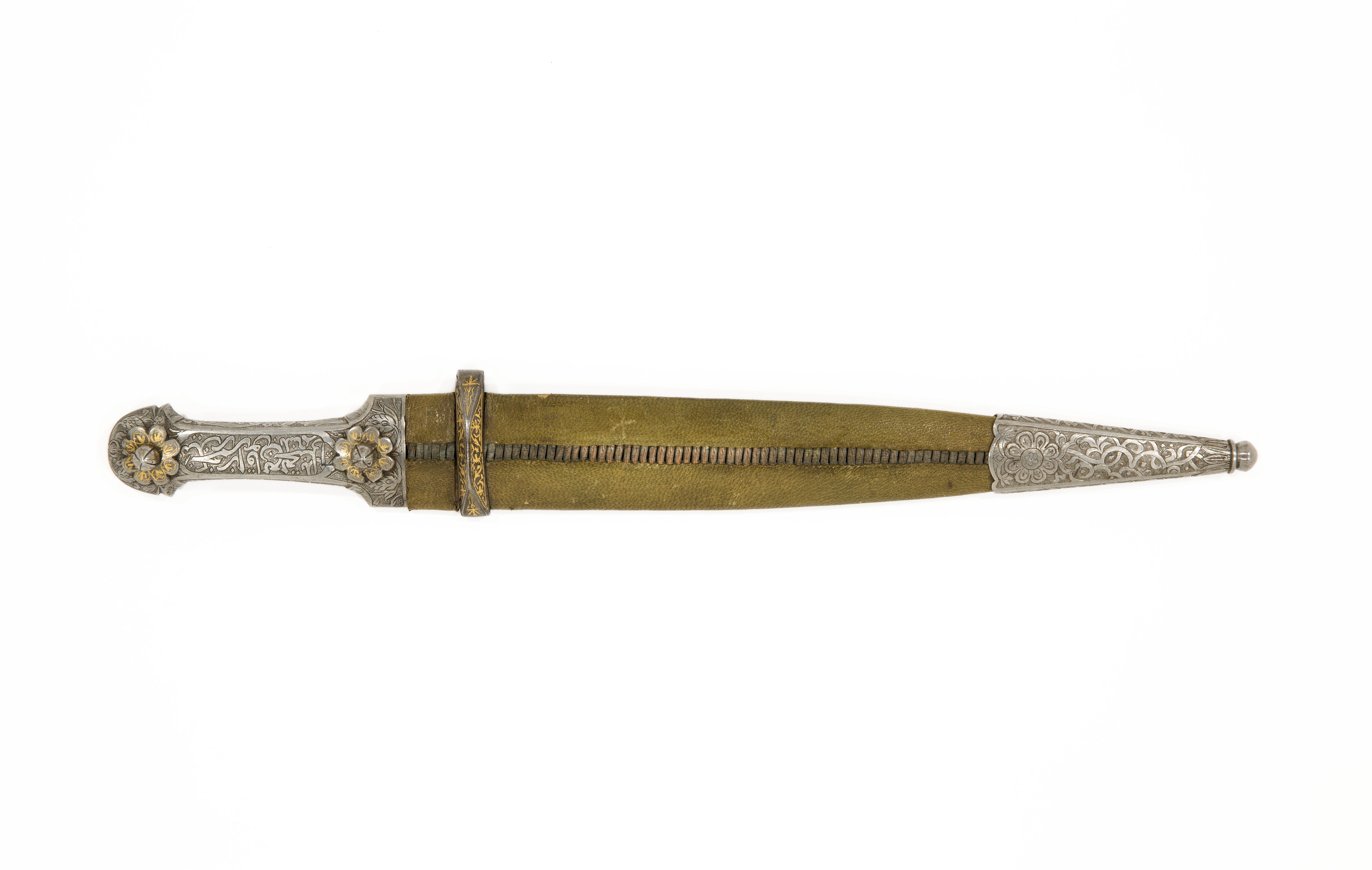 Balja klädd med grönt skinn, på utsidan ett längsgående band med horisontella trådar, lindade med silvertråd. Mellanband av stål med åsad kant på utsidan och fasade kanter och en stålögla på ena sidan, dekor i form av påslagna guldslingor. Doppsko, 86 mm av stål med konturerad kant, dekor i form av graverade blommor och slingor mot punsad botten. Ytteränden på doppskon är kulformad. Karl XV:s samling nr 83, gnr 3.7, 1872 förvarad i Turkiska rummet på Stockholms slott.
