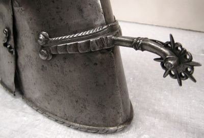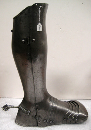 Av stålplåt i sammanlagt elva delar. Benpansar av två plåtar, rörformigt och drivna efter benets form. Mittås på bak- och framsida. Övre kant framtill närmast rak och enkelt avskuren, baktill lutande och omvikt inåt med snedställda punsade linjer. Mot insidan två gångjärn, mot utsidan upptill tapp genom (två) hål occh nertill tapp genom hål med hake. Sporre, L 73 mm. Bygeln räfflad med övre kant tunnt repstavsfilad, fäst på hälens utsida med två nitar i var ände. Halsen svagt nedåtsvängd, slät med profilerat mittparti och cirkulärt tvärsnitt. Trissan med åtta spetsar och åtta hål, rosformig? Oxmulesko av åtta delar, ökande i bredd mot tån. Bestående av sju skenor och en tåkappa. Skenorna nitade i kanterna omlott med viss rörlighet uppåt.