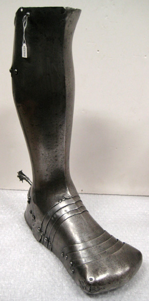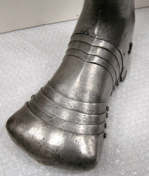 Benskena vänster med harnesksko, vänster. Till maximilanrustning, 1510-tal.
