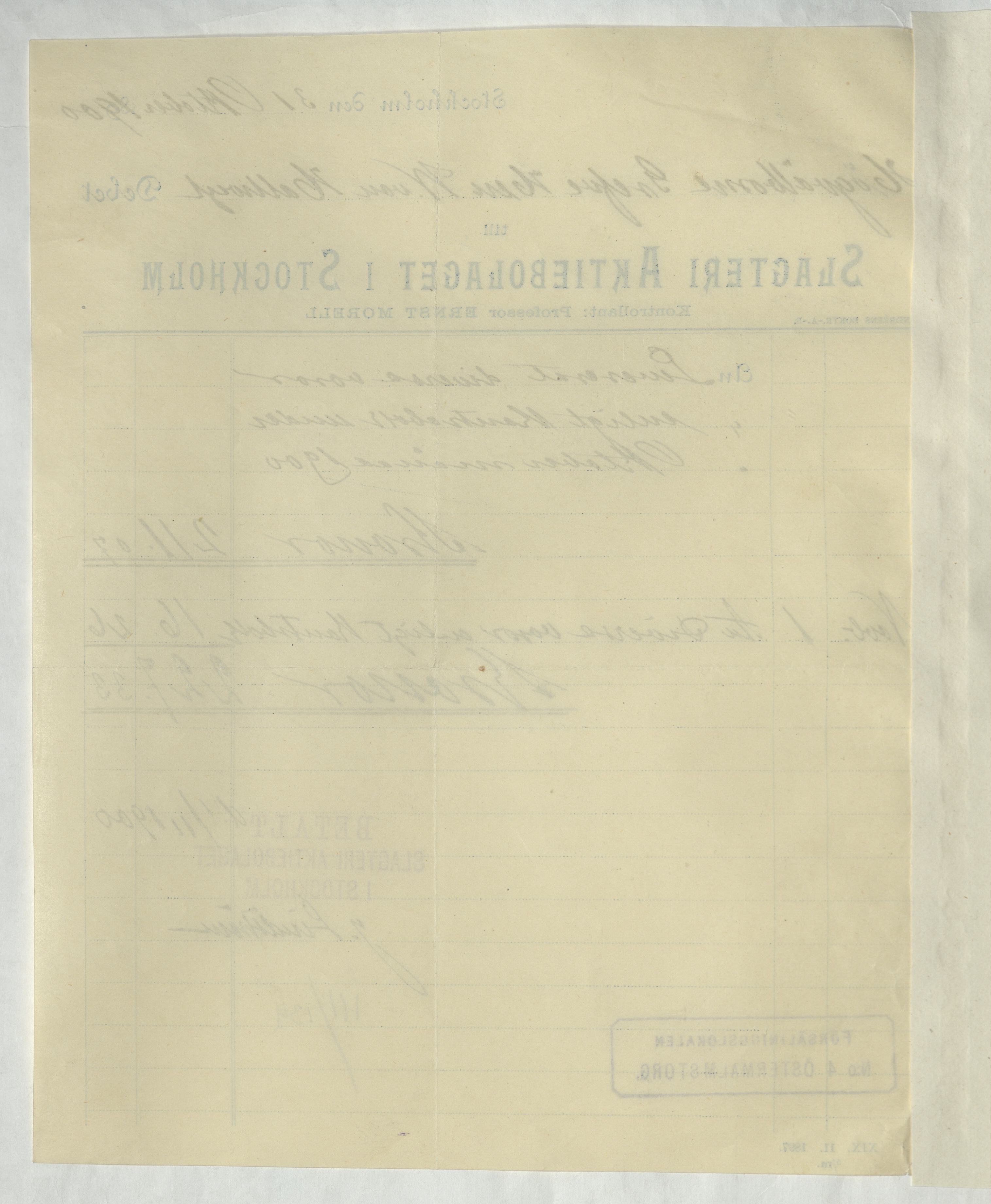 Kvitto från Slagteri Aktiebolaget i Stockholm