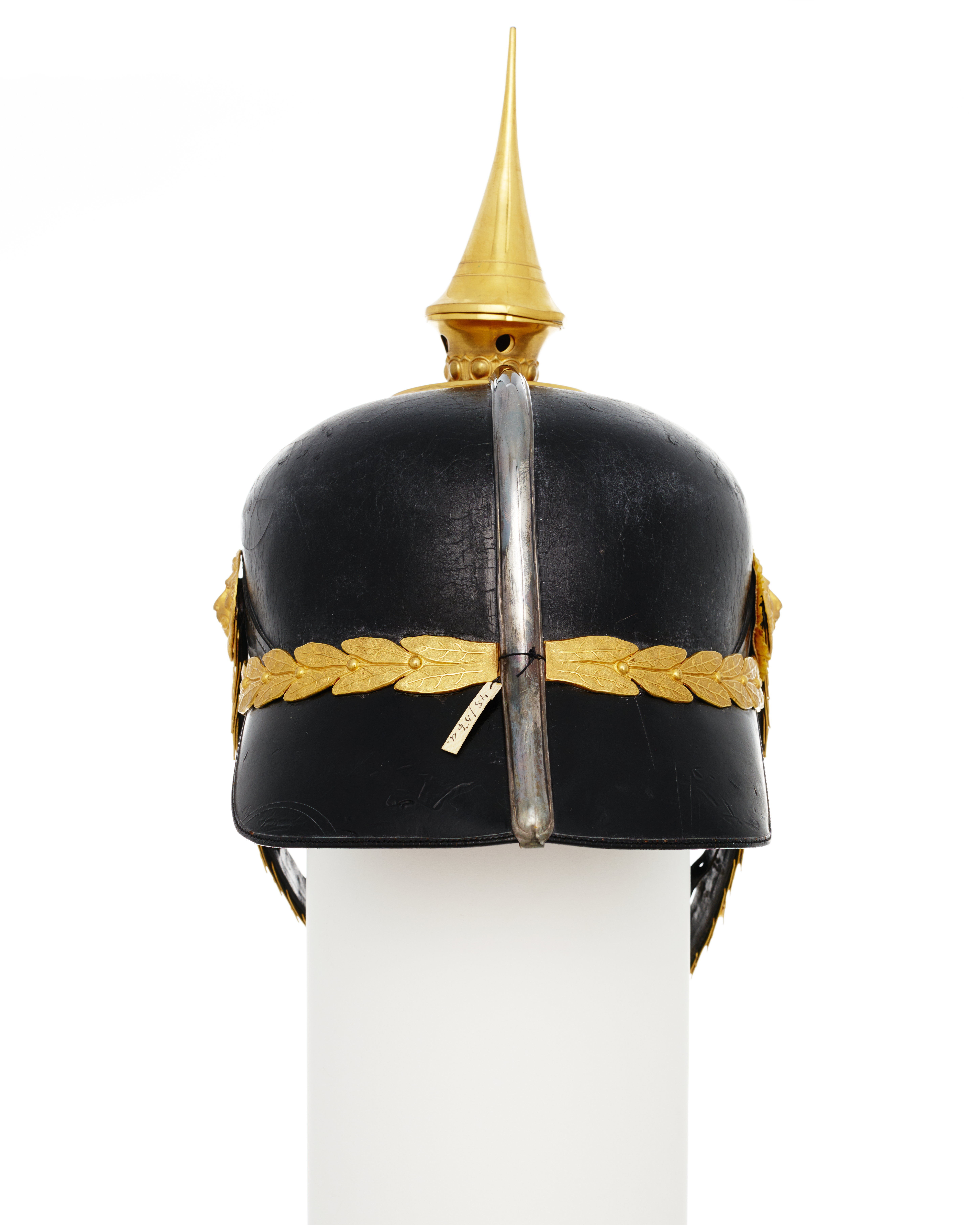Hjälm, modellenlig. Foder av brunt ylleripstyg. Svettrem av brunt läder, b: 60-65 mm.