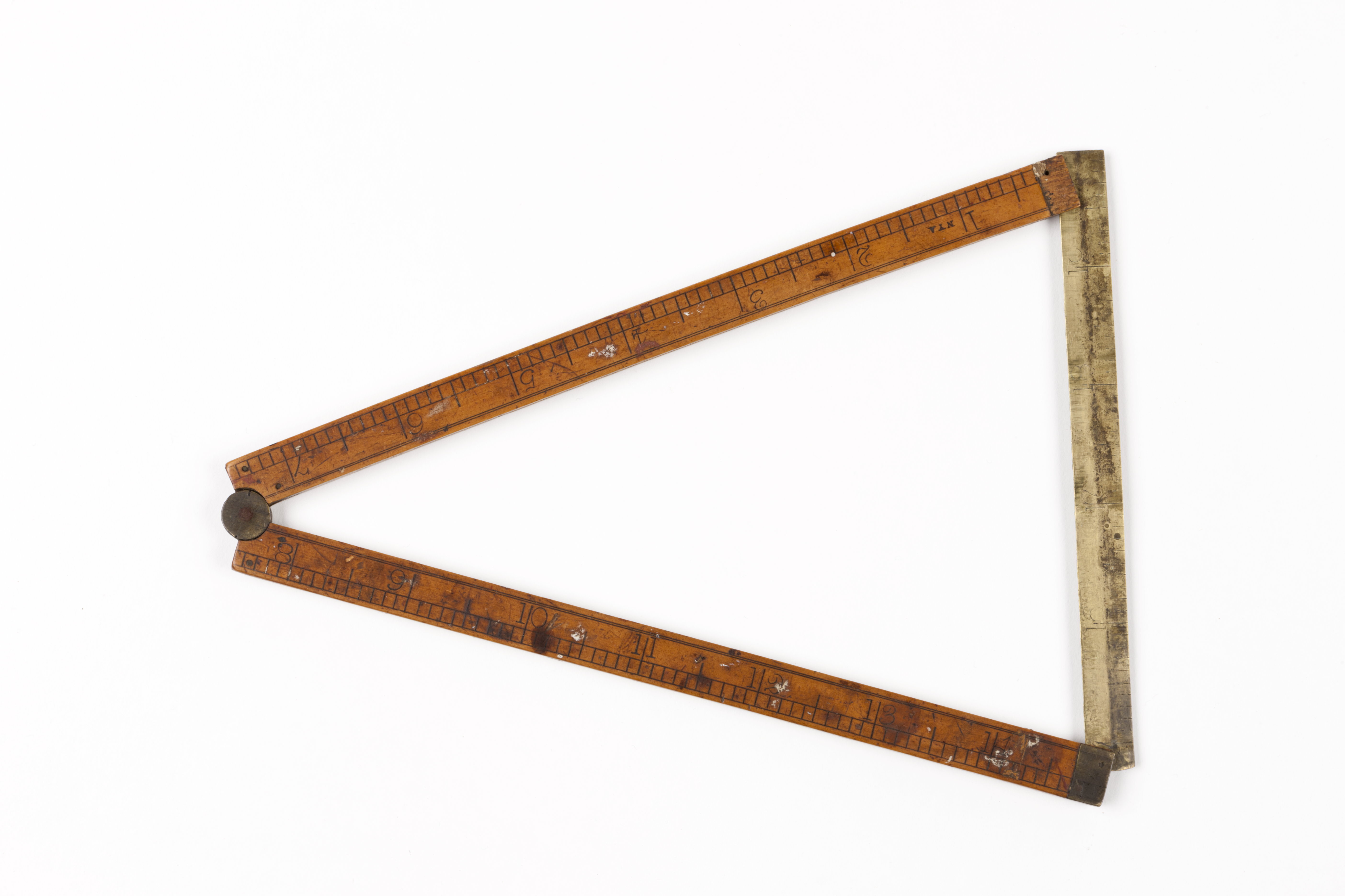 Måttstock av buxbom. Ledad på mitten. I ena änden finns ett infällbart mässingsben. Märkt på ena sidan: "GAMLA", på den andra sidan: "NYA" (tum). Stämplad: "STOCKHOLM".