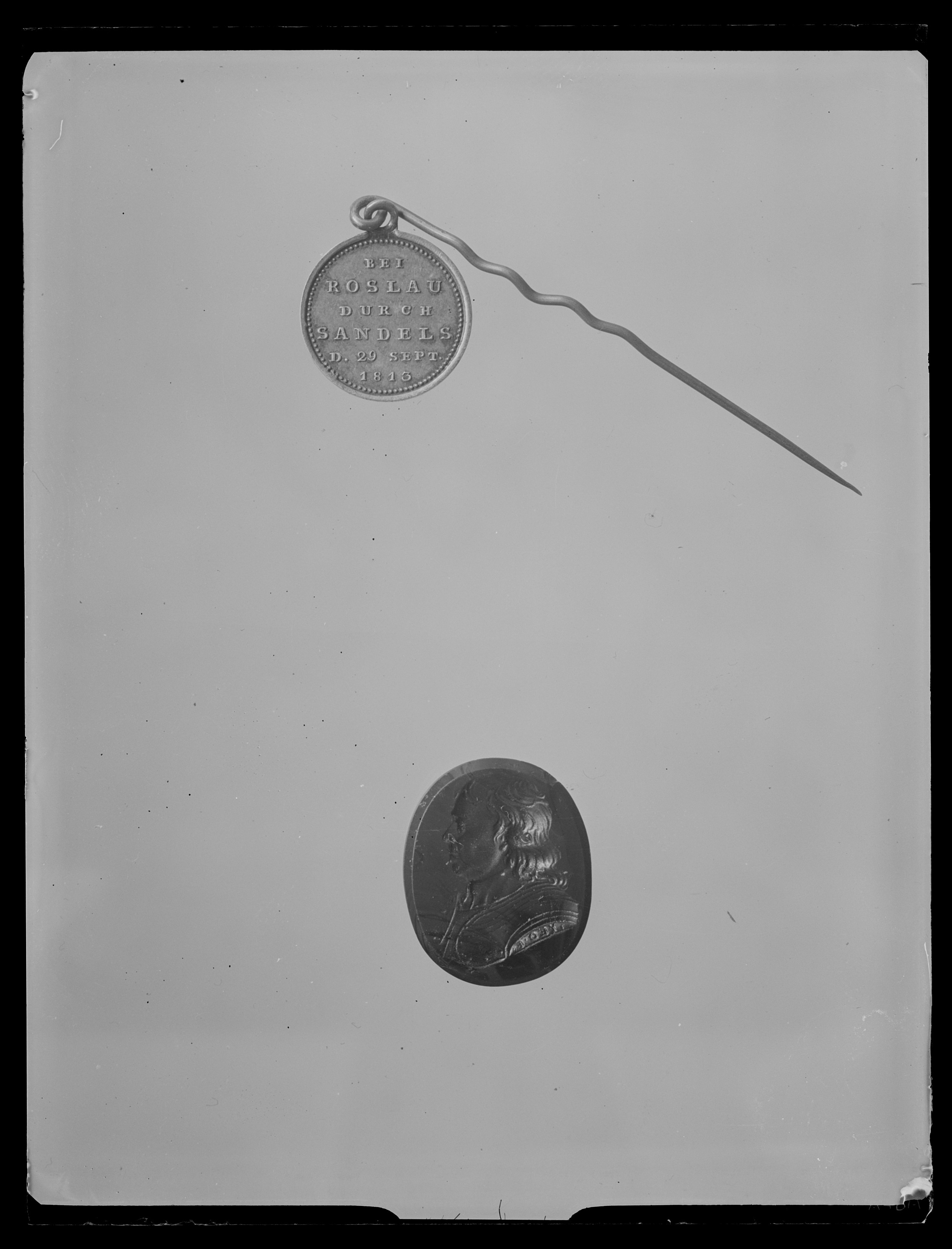 Åtsida: segergenie, helfigur, profil vänster, svärd med flamformig klinga samt lagerkrans, omskrift: "GOTT SEGNET DIE VEREINIGTEN HEERE" Frånsida, text: "BEI // ROSLAU // DURCH // SANDELS // D. 29 SEPT. // 1813". I överkanten ögla och däri fäst nål, l: 52 mm.