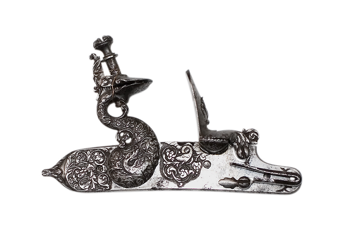 Plant låsbleck med graverad reliefdekor av slingor på bakspetsen och framför hanen. Hanen välvd och helt reliefdekorerad med slingor och ett odjur, lös överkäke. Käkskruv med tillplattat, kulformigt huvud, snidat som en blomma. Rundad fängpanna, batteri med smalt eldstål, på eldstålets rygg ett blad i relief. Batterifjäder med fasade kanter, slätt, välvt, flikigt fjäderlöv. På låsets insida en rund stämpel med en råtta, därnedanför: P P P.