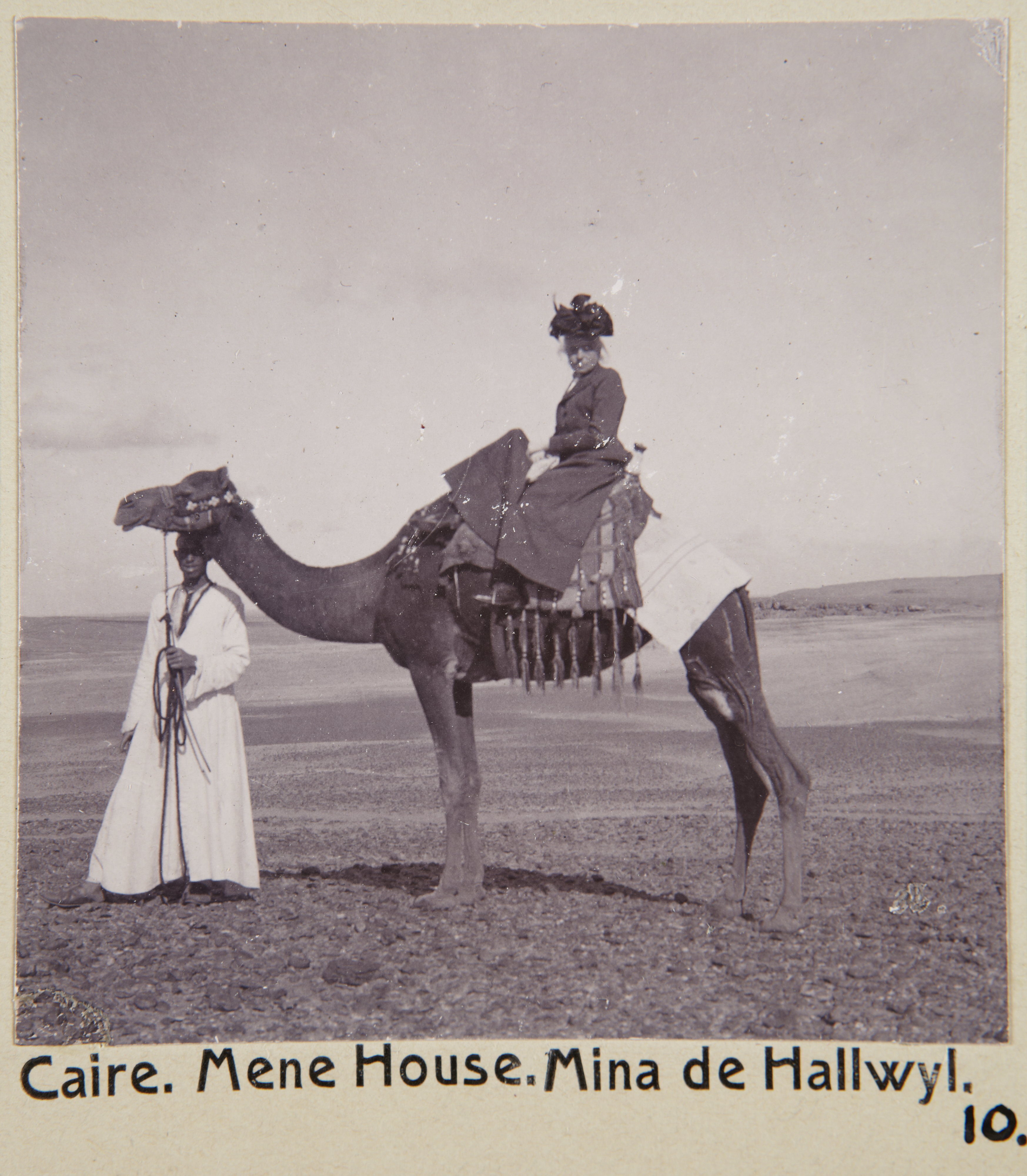 Kairo, Egypten. Mena House. Mina von Hallwyl. Text på fotografiet: Caire. Mena House: Mina de Hallwyl Fotografierna LXVI:M.01.- 201. kommer från resan till Egypten och Sudan som Wilhelmina och Walther von Hallwyl gjorde vintern 1900-1901. De lämnade Sverige den 5 november 1900 och fortsatte från Egypten till Palestina den 28 mars 1901. Med på resan var döttrarna Ellen med maken Henric de Maré och Irma med maken Wilhelm von Geijer. Wilhelminas sällskapsdam, fröken Ida Uhse reste också med. Under en del av resan anslöt sig ledamoten av Internationella domstolen i Kairo, assessorn Otto Conrad Waldemar Cedercrantz med makan Anna Elisabeth. Vid resan uppför Nilen hade Walther von Hallwyl hyrt ångfartyget Columbia med besättning. Båtresan startade i Kairo 27 december 1900, gick ända till Wadi Halfa varifrån man reste vidare med tåg till Khartum och tillbaka till Wadi Halfa. Båten vände åter i riktning mot Kairo, men det verkar som att sällskapet tog tåg sista biten, från Luxor. Henric och Ellen de Maré samt fru Cedercrantz lämnade båten redan då de passerade Luxor första gången. Resten av sällskapet återvände till Kairo den 1 mars. Fotografierna LXVI:M.01.-120. togs av resenärerna själva, de största av Ellen de Maré, de mellersta av Wilhelmina von Hallwyl och de minsta av Wilhelm von Geijer. Resten köptes av professionella fotografer i Kairo, de flesta från Studio Photogr. Artistique G. Lekegian & Cie. Alla uppgifter kommer från Ida Uhses reseanteckningar.