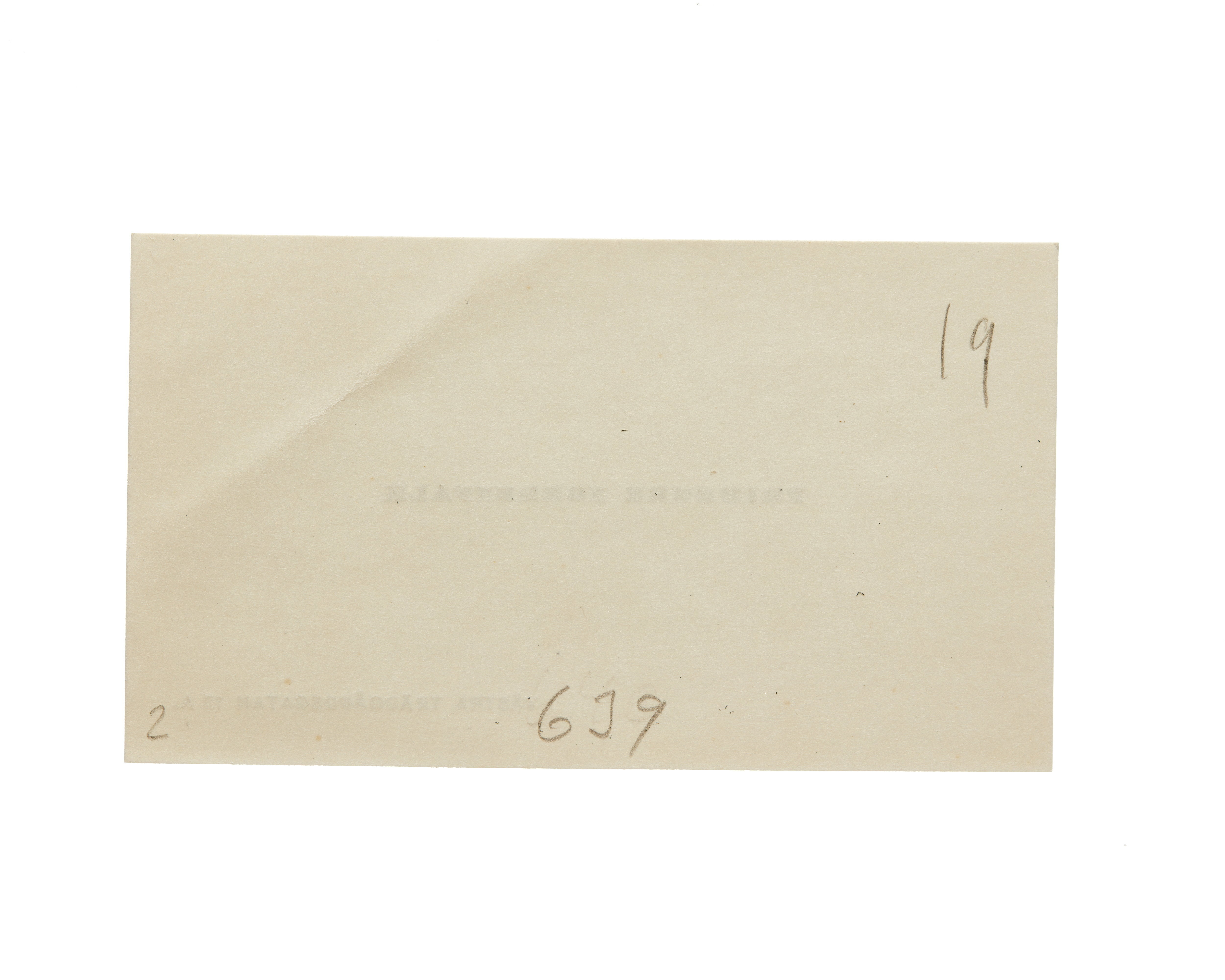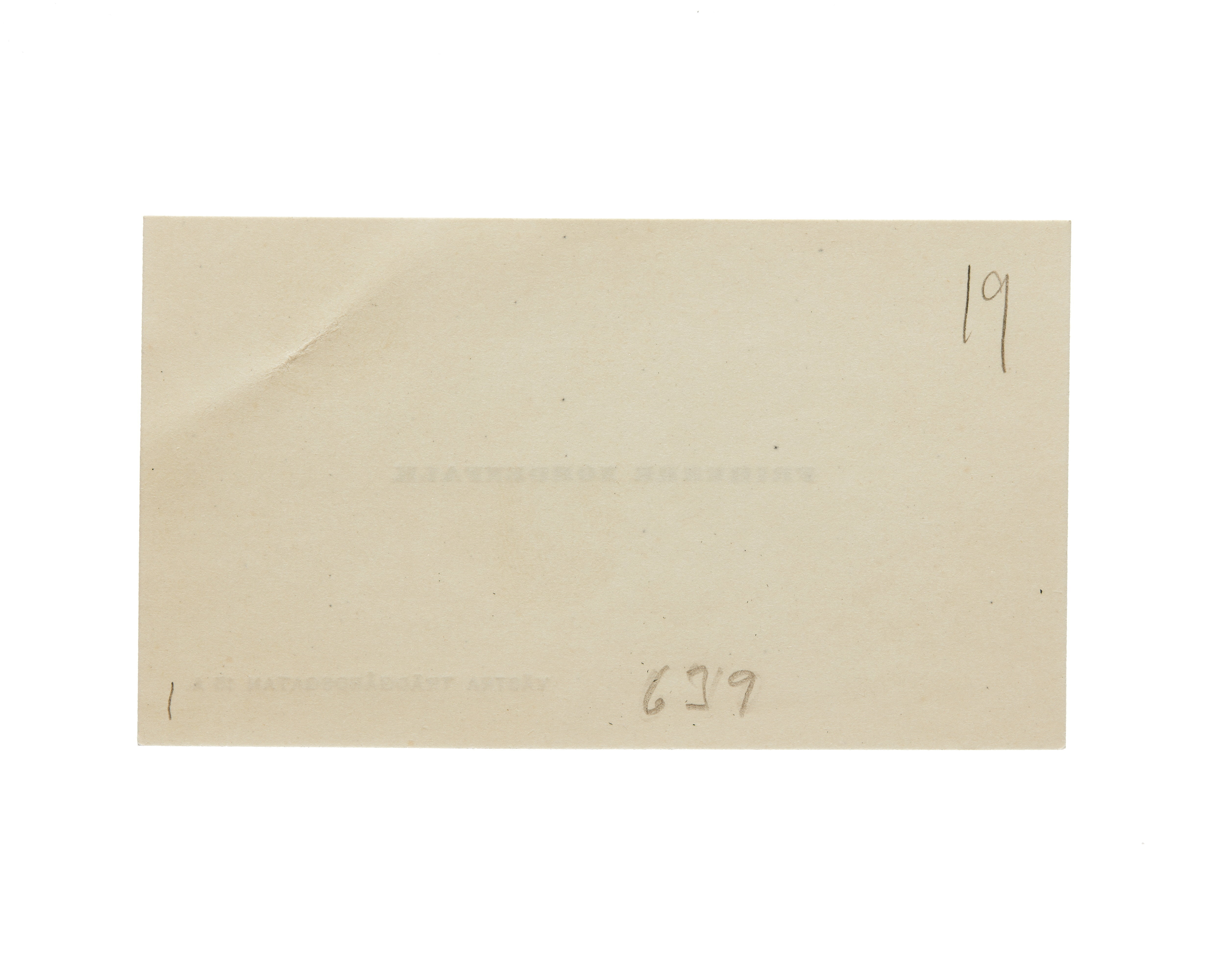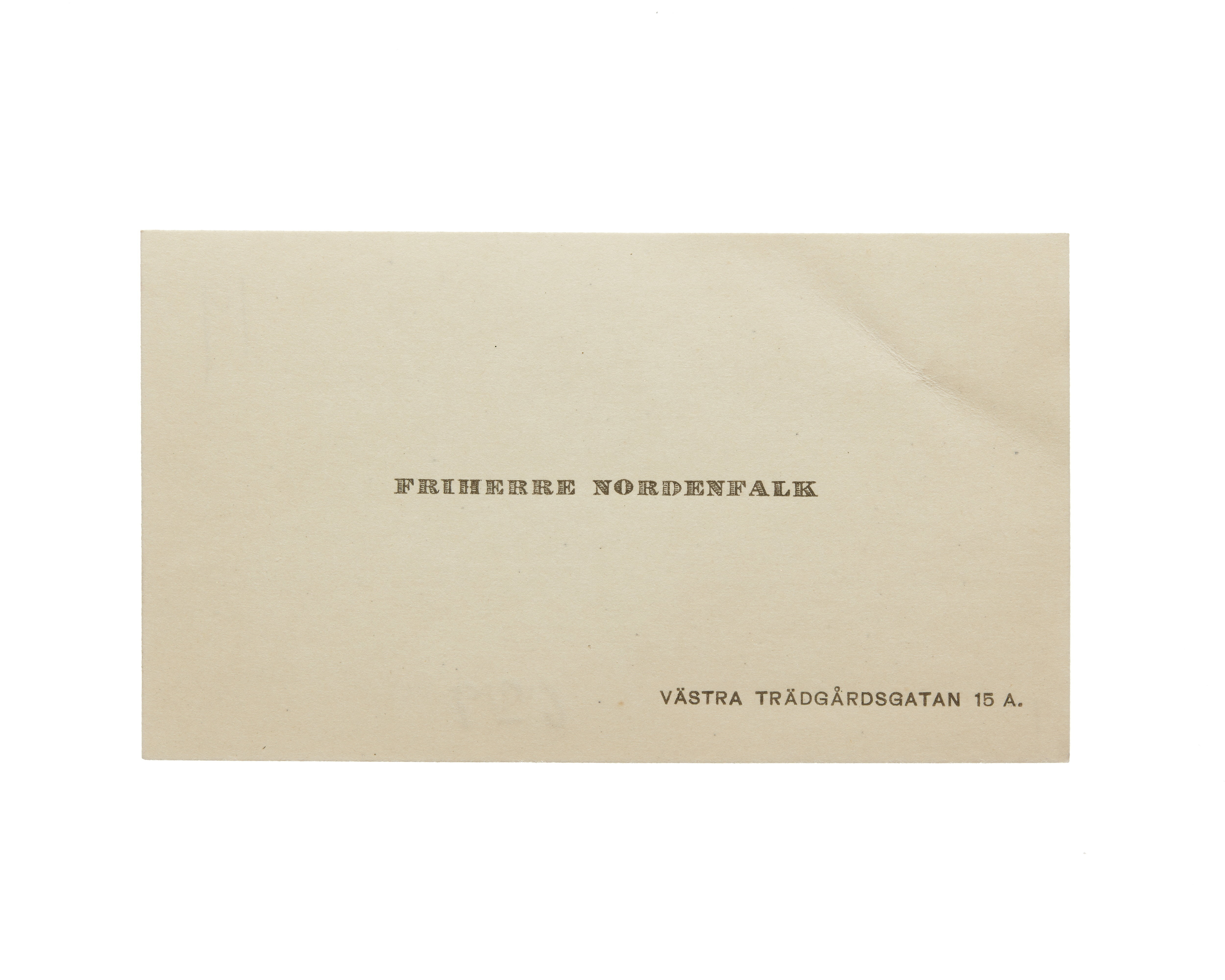 Två visitkort från Friherre Johan Axel Nordenfalk. Båda daterat 1919, vikt i övre högra hörnet. Adress (nedre högra hörnet) Västra Trädgårdsgatan 15 A.