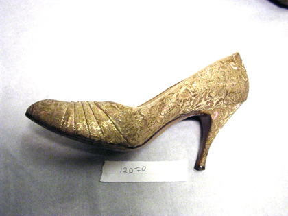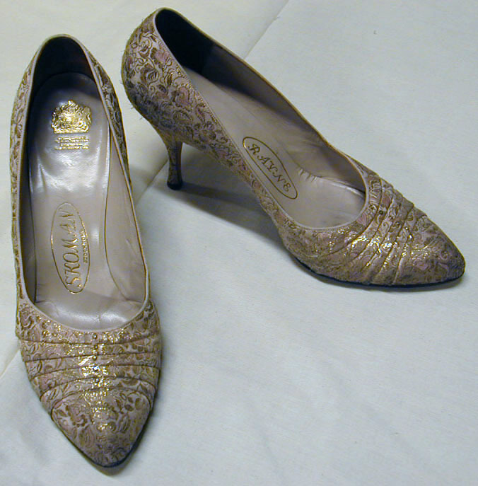 Pumps av guldlamé med en enkelsöm mitt bak. Skon har spetsig tå och en insvängd, hög och smal klack med stiftlapp fäst med två spikar i vitmetall. Lamén har beige botten med mönster av blomsterslingor i rosa och guld. Ringningen är kantad av ett beiget textilband. Skon är dekorerad framtill med fem draperade tvärställda veck samt fem små slipade och i gulmetall infattade, klara stenar/glas?. Foder och innersula av beigefärgat kalvskinn med hälförstärkning bak. På innersulan, i hålfoten finns en oval guldstämpel med text inuti: "SKOMAN // STOCKHOLM". På innersulans hälparti finns en guldstämpel i form av engelska riksvapnet samt text: "BY APPOINTMENT // TO H. M. THE QUEEN // SHOEMAKERS // H. & M. RAYNE LTD". På hälförstärkningens vänstra sida finns svart text: "Z B GODEY // 6361. 5.". Sulan är gjord av ljusbrunt läder (nöt?) med ett ristat rutmönster under tåpartiet. Stämplat under hålfoten: "MADE IN // ENGLAND". I hålfoten finns en handskriven svart tvåa.