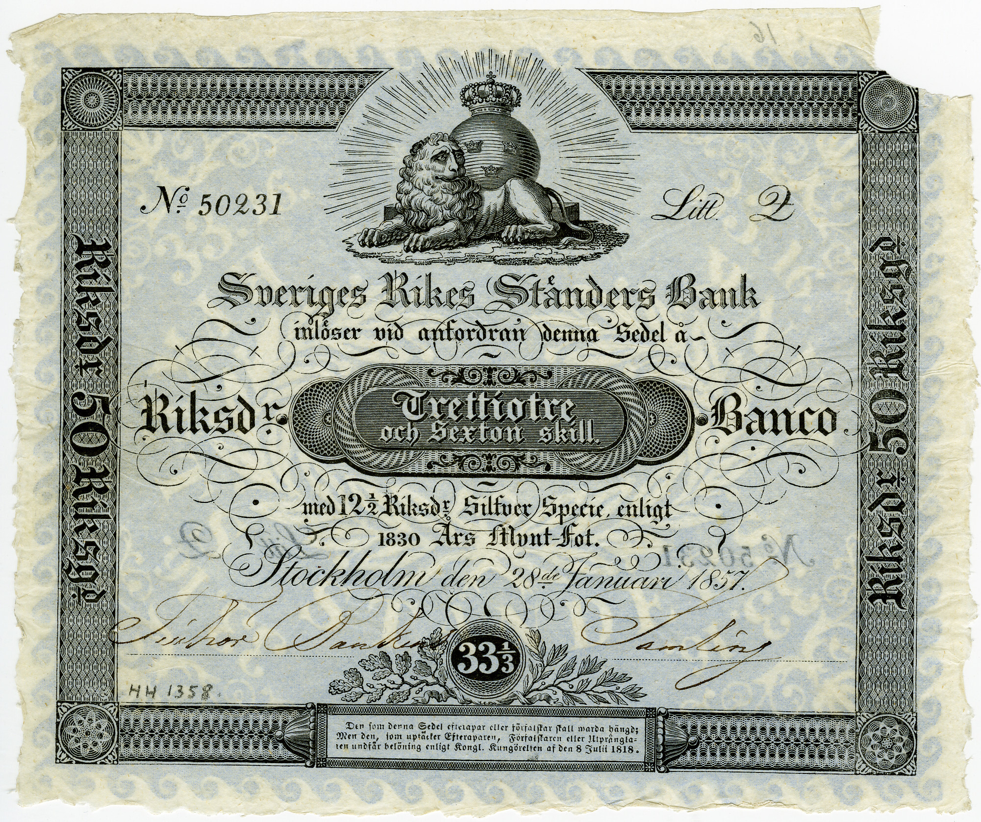Upphov: Sveriges riksbank. Media: Statens historiska museer. Ekonomiska museet - Kungliga myntkabinettet/SHM, (PDM) Upphovsrätten till detta verk har gått ut och är därmed fritt att använda på alla sätt. Ange gärna upphovsperson om denne är känd.