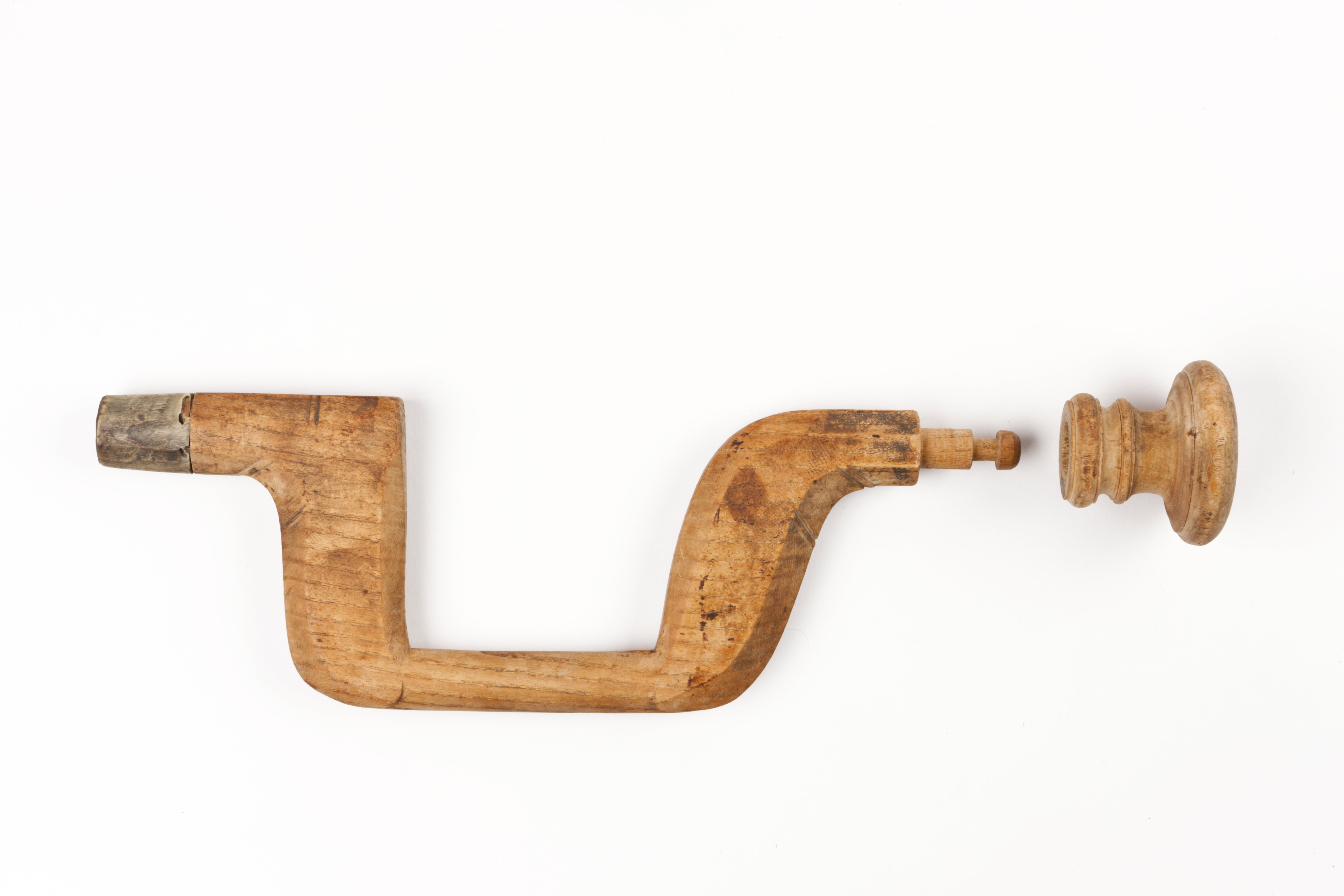 Svarvad knopp av masurbjörk. Hornbeslag runt borrhylsan.