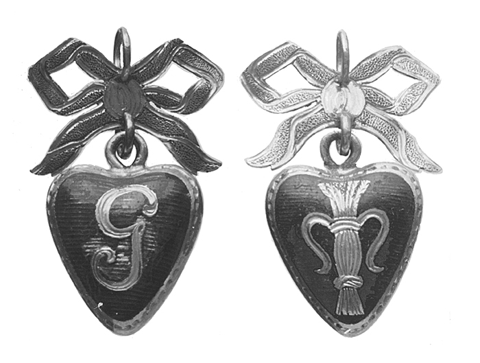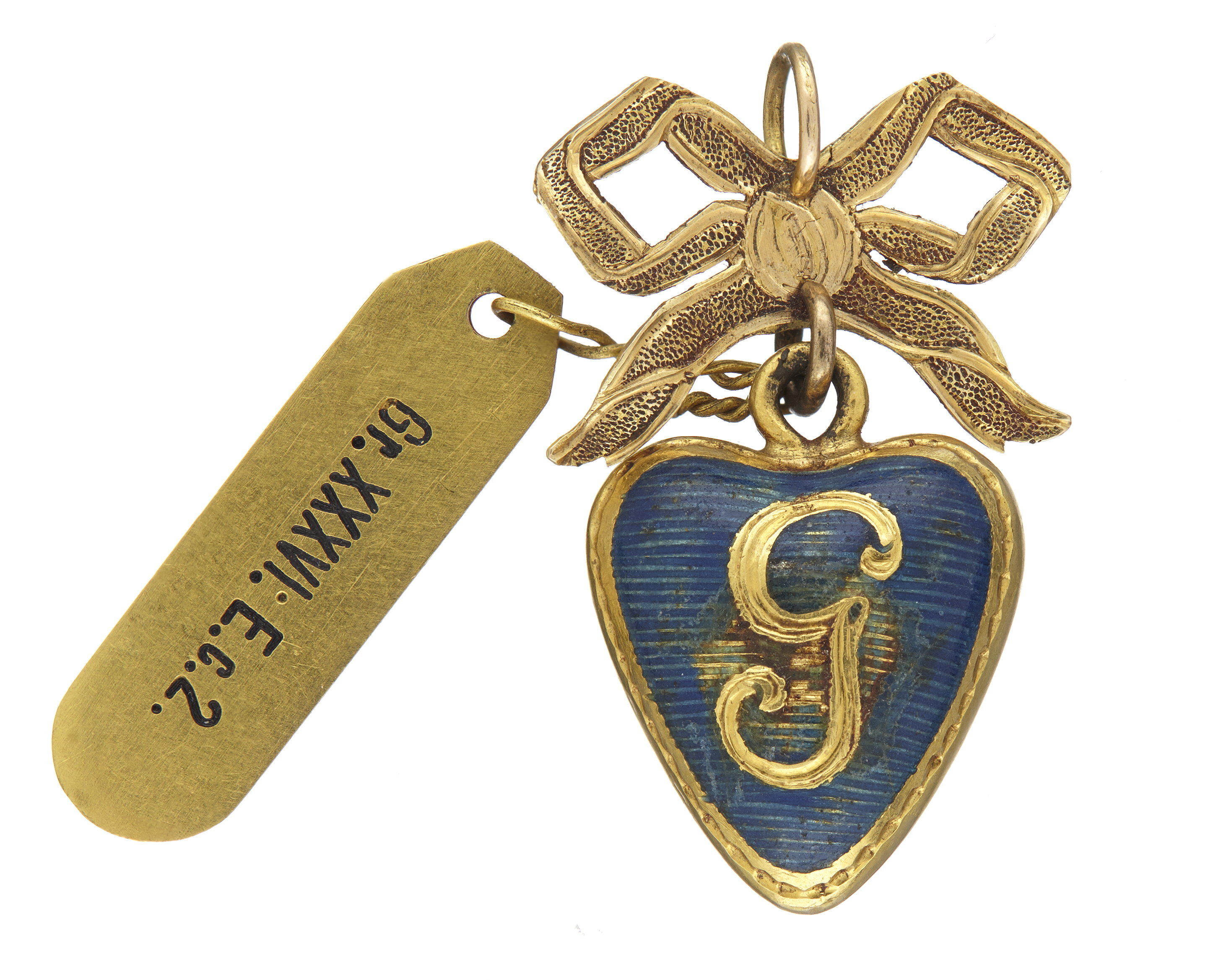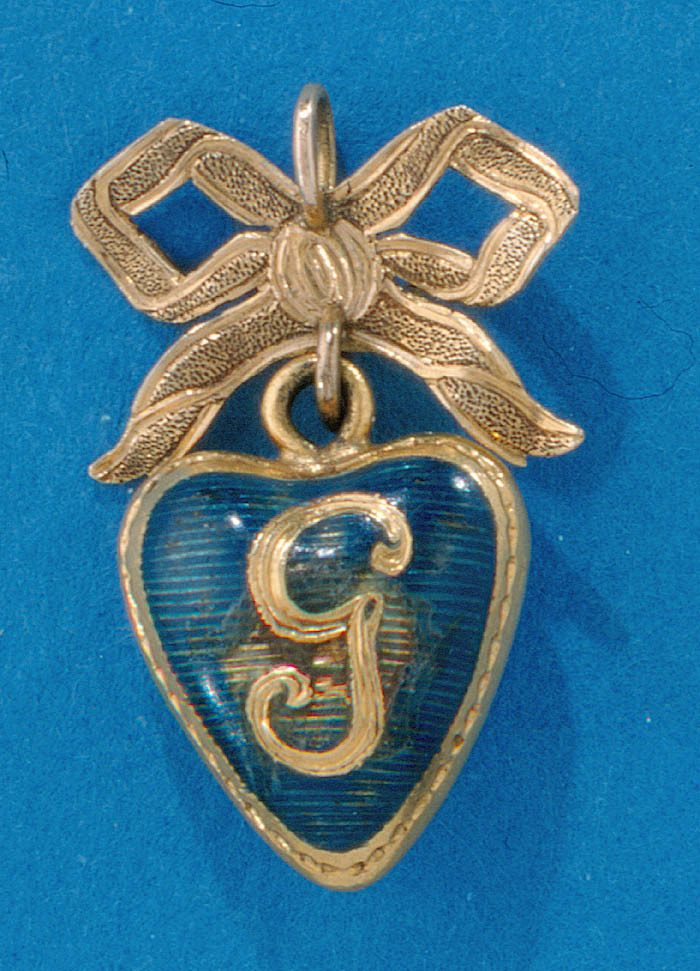 HÄNGSMYCKE Av guld med emalj. I form av ett hjärta med konvexa sidor, på dessa i guld mott botten i blå emalj med tvärrandig bottenrelif ett G (Gustaf), på den andra Vasa-vapnet. På övre ändan en rundstavig ögla vari fäst med en ögla en bandrosett med punsade sidor. Utan stämplar. Höjd: 2,6 cm. Hjärta med ögla, höjd: 1,7 cm, bredd: 1,3 cm. Rosett höjd: 1,3 cm, bredd: 1,7 cm. Svenskt arbete från 1772 eller tiden strax efter. Antagligen utförd till minne av Vasaorderns instiftande genom konung Gustaf III, möjligen också hänsyftande på konungens härstammning från den gamla svenska Vasa-dynastin. Gåva till Wilhelmina von Hallwyl julafton 1895 från hennes mor. Inköpt av den sistnämda på auktion hos konsthandlare H Bukowski, Stockholm.