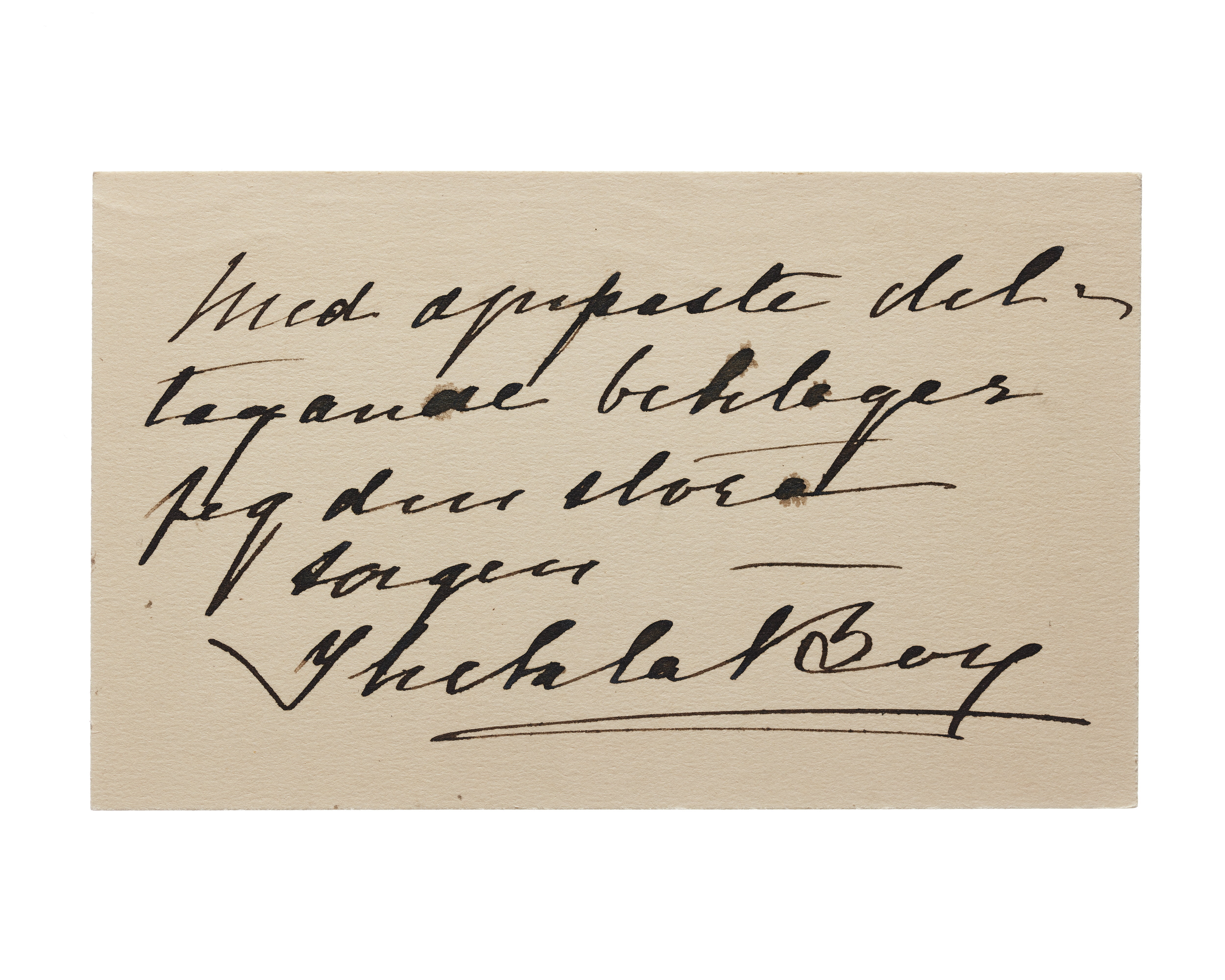 Ett kort från Överstinnan Thekla Boy f. Milow. Handskrift "med djupaste deltagande beklagar jag den stora sorgen, Thekla Boy". Finns ett anteckningkort med handskrift "73 fel, skall vara Boy, 126" och det betyder Thekla Boy har andra kort som katalogiserade i nummer 126.