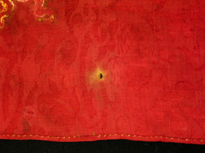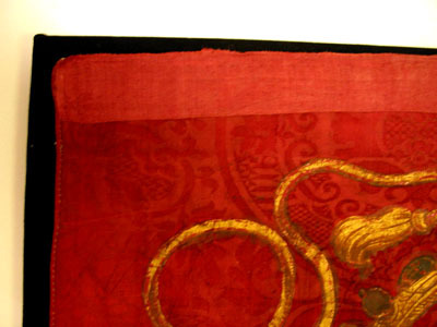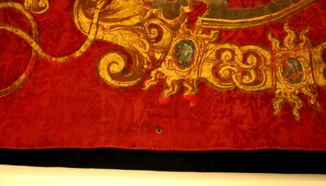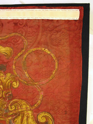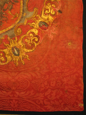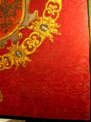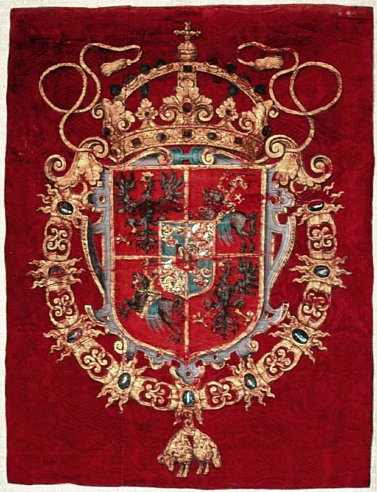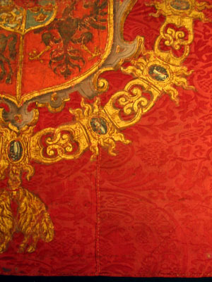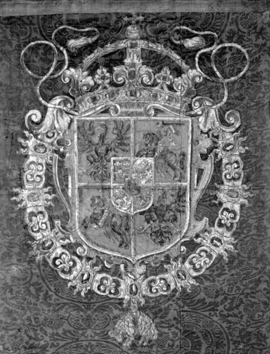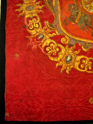 Fanduk av karminröd sidendamast i två vertikala våder, 260 och 525 mm breda, omvikta, kastade kanter. På båda sidor målat det polska riksvapnet krönt av en kunglig krona, en vapensköld lagd på en rullverkskartusch i olika grå nyanser med guldfärgade kanter, skölden omgiven av Gyllene Skinnets ordenskedja och klenod. Skölden är kvadrerad med guldkanter, alla fälten röda, i fält 1 och fyra i silver (nu grått) Polen (silverörn med guldbeväring, krönt med krona av guld), i fält 2 och 3 Litauen (ryttare i rustning av guld med lyft svärd med silverklinga och guldfäste, på v arm en röd sköld med ett två gånger korsat kors av guld. Hästen av silver med seldon av guld, hästtäcke målat med grå färg. Hjärtsköld likaså kvadrerad med guldkanter, fälten blå, i fält 1 och 4 tre kronor av guld (2,1), i fält 2 och 3 tre grå strömmar och däröver ett krönt lejon av guld. Innersköld Vasa. två gånger styckat av blått, silver och rött och däröver en Vase i guld. I nedre v hörnet på baksidan fäst en pappersetikett med otydlig bläckpåskrift: två rader otydlig text upptill och nertill samt däremellan No 4. (etiketten veckad