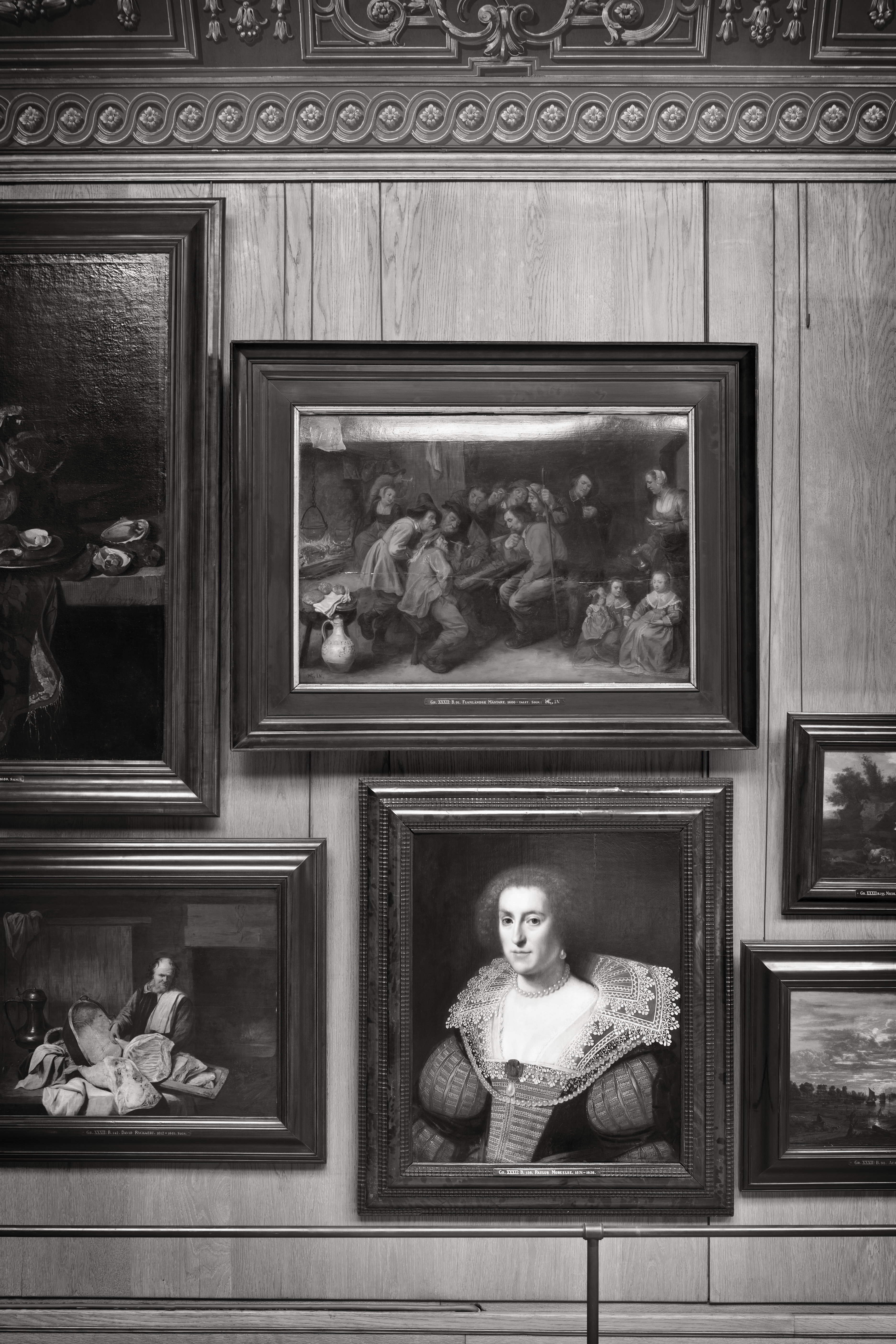 - Amalia, grefvinna af Solms-Braunfels, som medelålders. Halffigur. Vänd halft åt vänster, hufvudet i fjärdedelsprofil åt vänster; mörkt gråbruna ögon med stora pupiller samt blåaktiga hvitögon, blicken åt åskådaren; bakåt-kammadt krusigt gråbrunt hår, mera utstående vid sidorna och täckande öronen. Röd underklädning, framtill med djup fyrsidig urringning samt garnerad med tvärgående smala silfvergråa band; ärmarna med dubbla puffar, i dessa längdgående upp-slitsningar med ljusgråa isättningar, kantade med smala snören i samma färg. Tätt åtsittande svartbrun öfverklädning med otydligt mönster, smala axelstycken och grönt skärp samt lämnande underklädningen fri framtill och å ärmpuffarna. Innanför axelstyckena en smal remsa af tunt hvitt tyg med smal kantspets af femflikiga uddar. Däröfver en yfvigt utviken styf bred spetskrage med ytterkant af mångflikiga runda uddar, hvarje omslutande en sexuddig stjärna inom en ring; samma mönster upprepadt som bredare bårder inuti spetsen, de smalare bårderna fyllda af sicksackband. Halsband af stora hvita pärlor, hvaraf aderton synliga, i vänstra örat en stor päronformig hvit pärla. Från axlarna ett i båge öfver bröstet hängande band af dylika pärlor, af hvilka femtiofyra synliga; ofvanför den först nämnda pärlraden från vänstra axeln till midten å bröstet en länk af tjugutvå dylika pärlor, framtill fäst vid en fyröglig mörkgrön bandrosett, i hvars nedre ögla en stor päronformig hvit pärla. Bakgrund mörkt gråbrun. Ljuset framifrån vänster. Ej signerad. På trä (ek). Anm. Å framsidan till höger om midten en vertikal fog synlig. Å baksidan ofvanför midten fastklistradt en liggande rektangulär, gråhvit papperslapp, hvarå tryckt (orig. 2/i): Ofvanför papperslappen ett med nedre kanten å densamma nedskjutande rödt lack, hvarå: Ofvanför lacket fastklistradt en större, liggande rektangulär, gråhvit papperslapp med afklippta hörn, hvarå med mörkt bläck skrifvet (orit V.) Höjd: 0.63 m.; bredd: 0.545 m. Amalia, grefvinna af Solms-Braunfels, f. 31 Augusti 1602, d. 8 Augusti 1675, förmäld 4 April 1625 med Fredrik Henrik, prins af Oranien, arfståthållare i Nederländerna, f. 24 Februari 1584, d. 14 Mars 1647; var mor till Wilhelm II af Oranien (1626— 1650), se B.131. Paulus Moreelse (i gamla kataloger äfven Morillo och Murillio), f. 1571 i Utrecht, d. 19 Mars 1638 därstädes; lärjunge af Michiel Jansz. van Mierevelt i Delft samt mästare i Utrecht 1596; porträtt- och historiemålare samt arkitekt. Enligt Alfred von Wurzbach: »Niederländisches Künstler-Lexikon», Zweiter Band, Wien und Leipzig 1910. Jmfr B.158. Se Olof Granberg: »Inventaire général des trésors d’art, peintures & sculptures, principalement de maîtres étrangers (non Scandinaves) en Suède», Tome III, Stockholm 1913, 286 a (sid. 84 och 85; plansch 97). Taflan afbildad med text i »Personhistorisk Tidskrift» I, Stockholm 1900, porträtt n:r 10, text sid. 231; jämför »Personhistorisk Tidskrift» II, Stockholm 1901, sid. 52 och 53. — Gick vid tiden för inköpet som föreställande drottning Maria Eleonora af Sverige (1599—1655), Gustaf II Adolfs gemål. Oriktigheten häraf framgår med all tydlighet vid jämförelse mellan taflan och ett fullt autentiskt porträtt af furstinnan, exempelvis det som finnes på slottet Homburg vor der Höhe i Hessen, Tyskland, (se Svenska Dagbladet n:r 257, September 1922, Georg W. Fleetwood: »Svenska porträtt i Hessen») och som visserligen visar henne i förlofningsåldern, 1619, men som företer så väsentliga olikheter i fråga om ansiktets karaktär, att de båda porträtten omöjligen kunna föreställa en och samma person. Däremot visa ett flertal kända bilder af Amalia af Solms påtaglig likhet med här ifrågavarande porträtt. — Vidare gällde taflan vid den angifna tiden som målad af Michiel van Mierevelt (1567—1641, furstehuset Nassau-Oraniens hofp Ram (gammal): Af trä, fanerad med sköldpadd; på blindram af furu. Profil som figuren (orig. 8/i): Glas. Höjd: 0.845 m.; bredd: 0.725 m. Inköpt af Wilhelmina von Hallwyl, f. Kempe, å auktion hos Aktiebolaget H. Bukowskis Konsthandel, Stallgatan 1, Stockholm, 23 September 1908. Katalog 179 n:r 1, se räkning 29 September 1908. Betald 12 Oktober 1908, se Toilettbok (här uppförd på November 1908). Pris: Kr. 5800, se räkning. Inköpt för en del af de julpengar, Johanna Kempe, f. Wallis, skänkt sin dotter och svärson, Wilhelmina och Walther von Hallwyl, samt på den grund egentligen att uppfatta som en julgåfva från henne Julaftonen 1908. Kända tidigare ägare, se auktionskatalog 179: i. Jean Henri Beissels i Aachen (Aix-la-Chapelle) samling, försåld å auktion i Brüssel 6 April 1875, eiiligt uppgift af C. Burenstam i »Personhistorisk Tidskrift» II, Stockholm 1901, sid. 53 (»å auktion i Briissel på Beissatska [sic!] tafvelsamlingen ditsänd från Aachen»). 2. F. d. svenske ministern vid kungl. belgiska och kungl. nederländska hofven kammarherren fil. doktor Carl Johan Reinhold Burenstam, f. 10 November 1829, d. 17 Januari 1907. 3. Kammarherren Carl Burenstams arfvingar. Af dessa försåld å ofvannämnda auktion 23 September 1908.