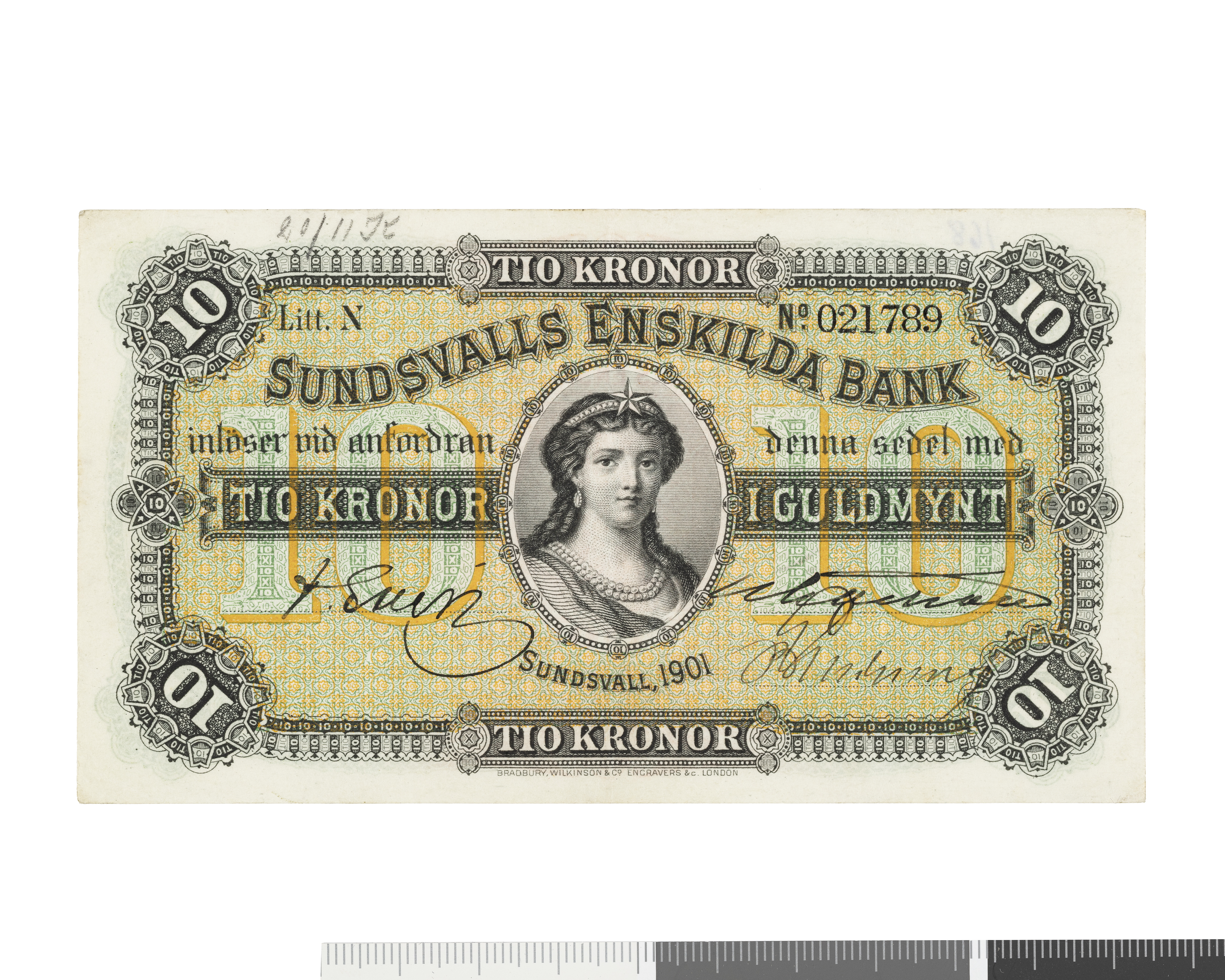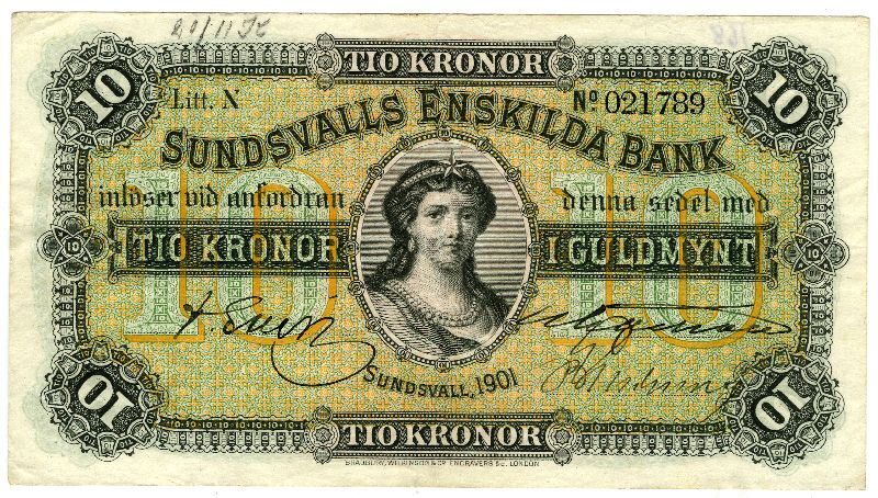 Upphov: Sundsvalls Enskilda bank. Media: Bonnevier, Helena. Ekonomiska museet - Kungliga myntkabinettet/SHM, (PDM) Upphovsrätten till detta verk har gått ut och är därmed fritt att använda på alla sätt. Ange gärna upphovsperson om denne är känd.