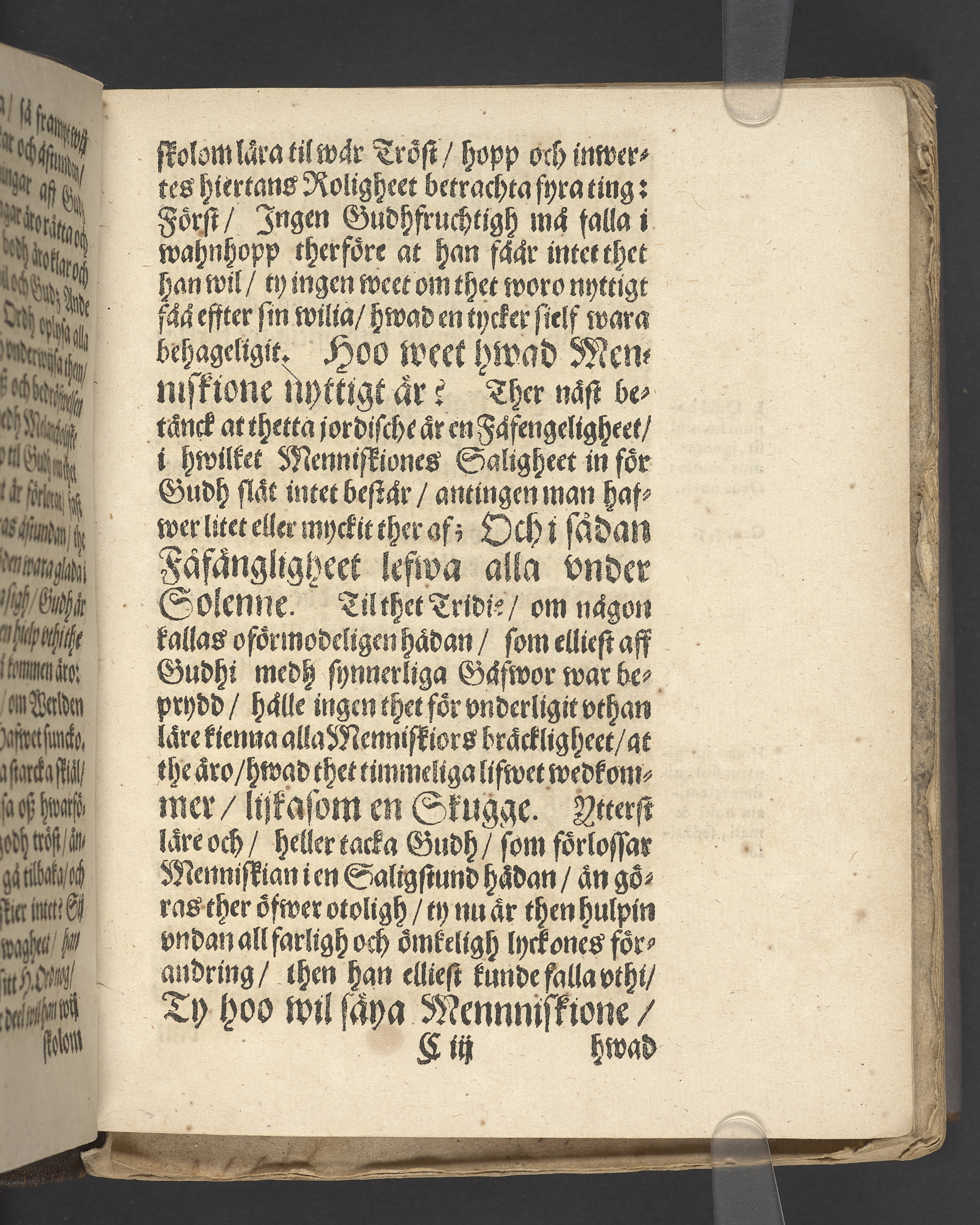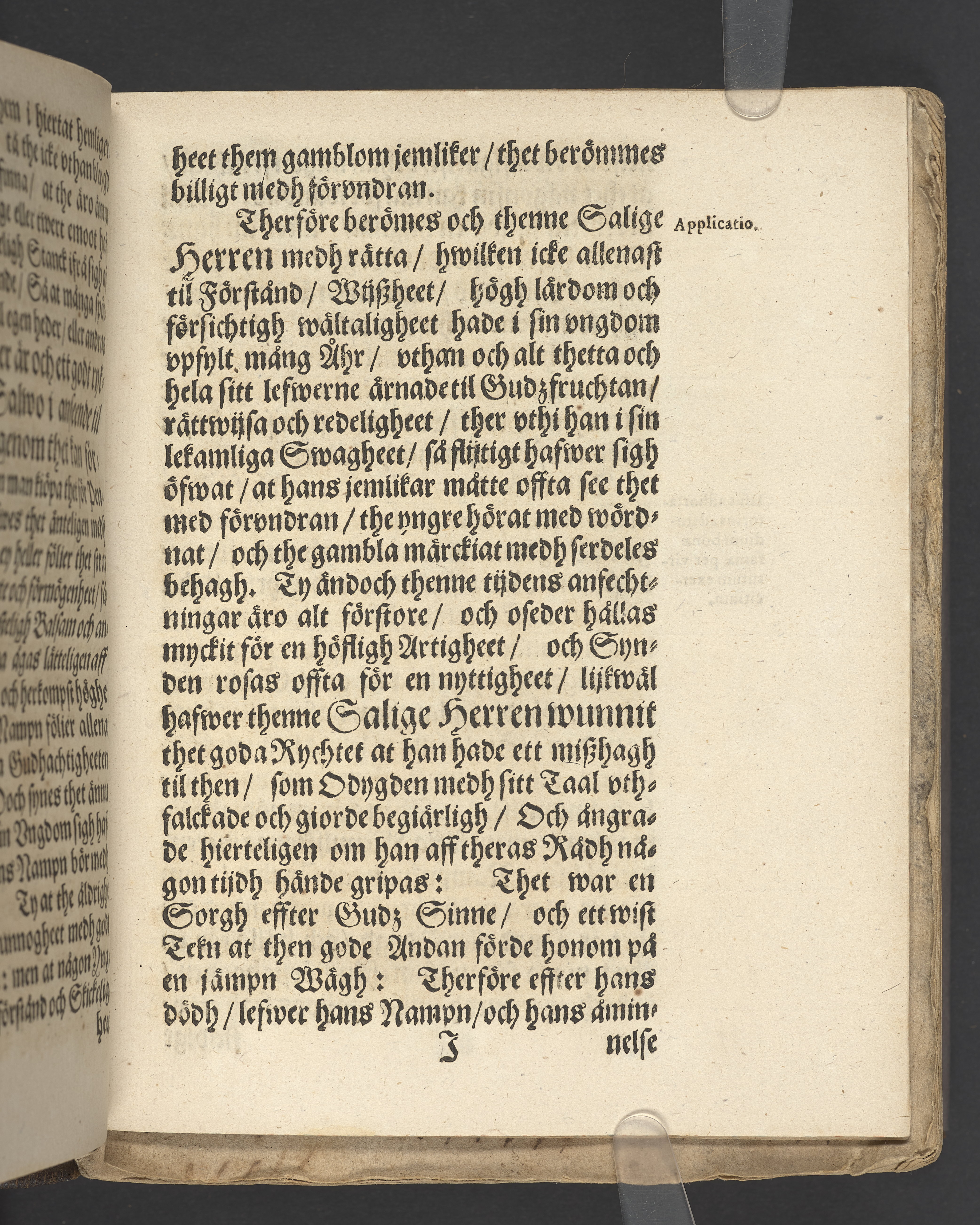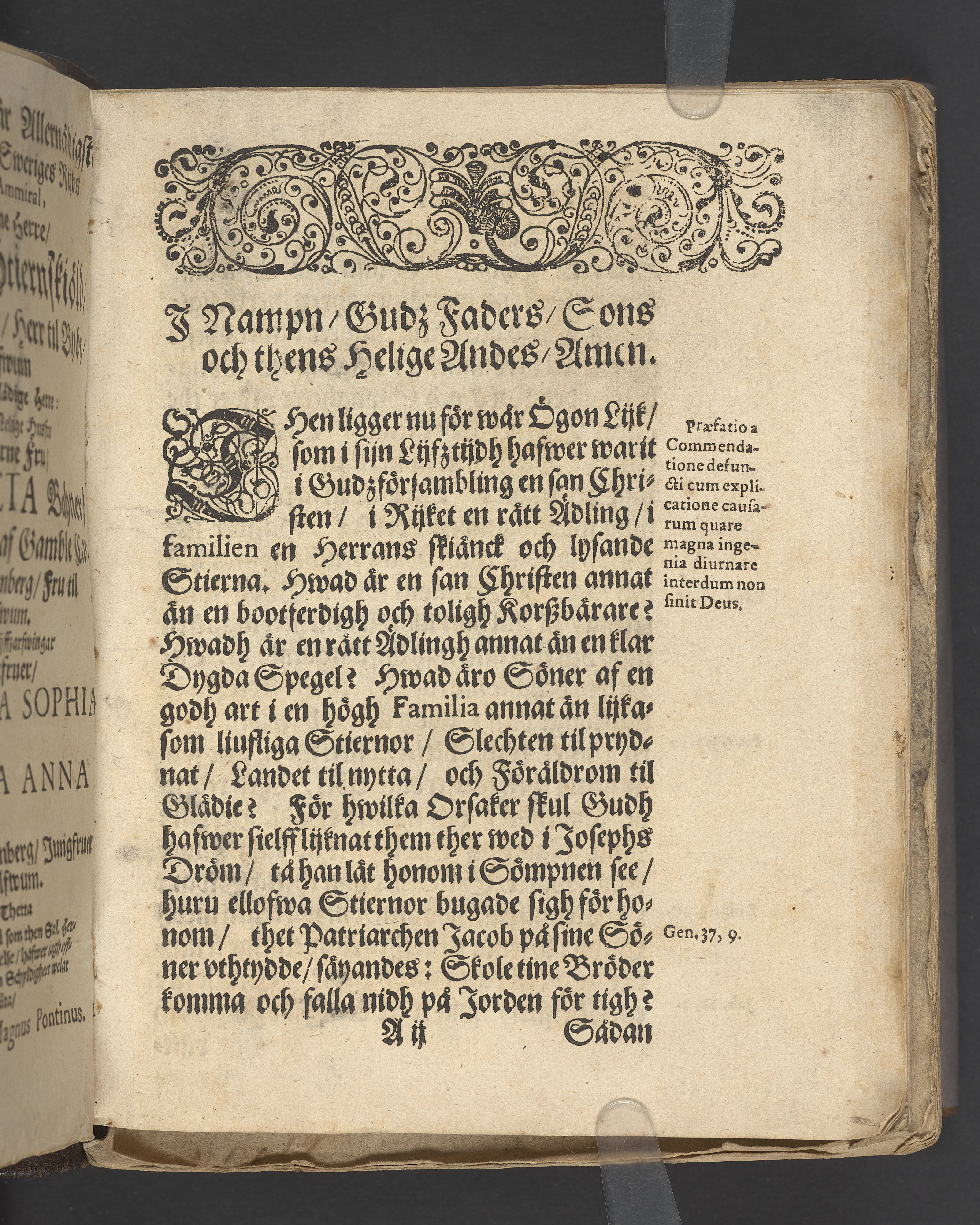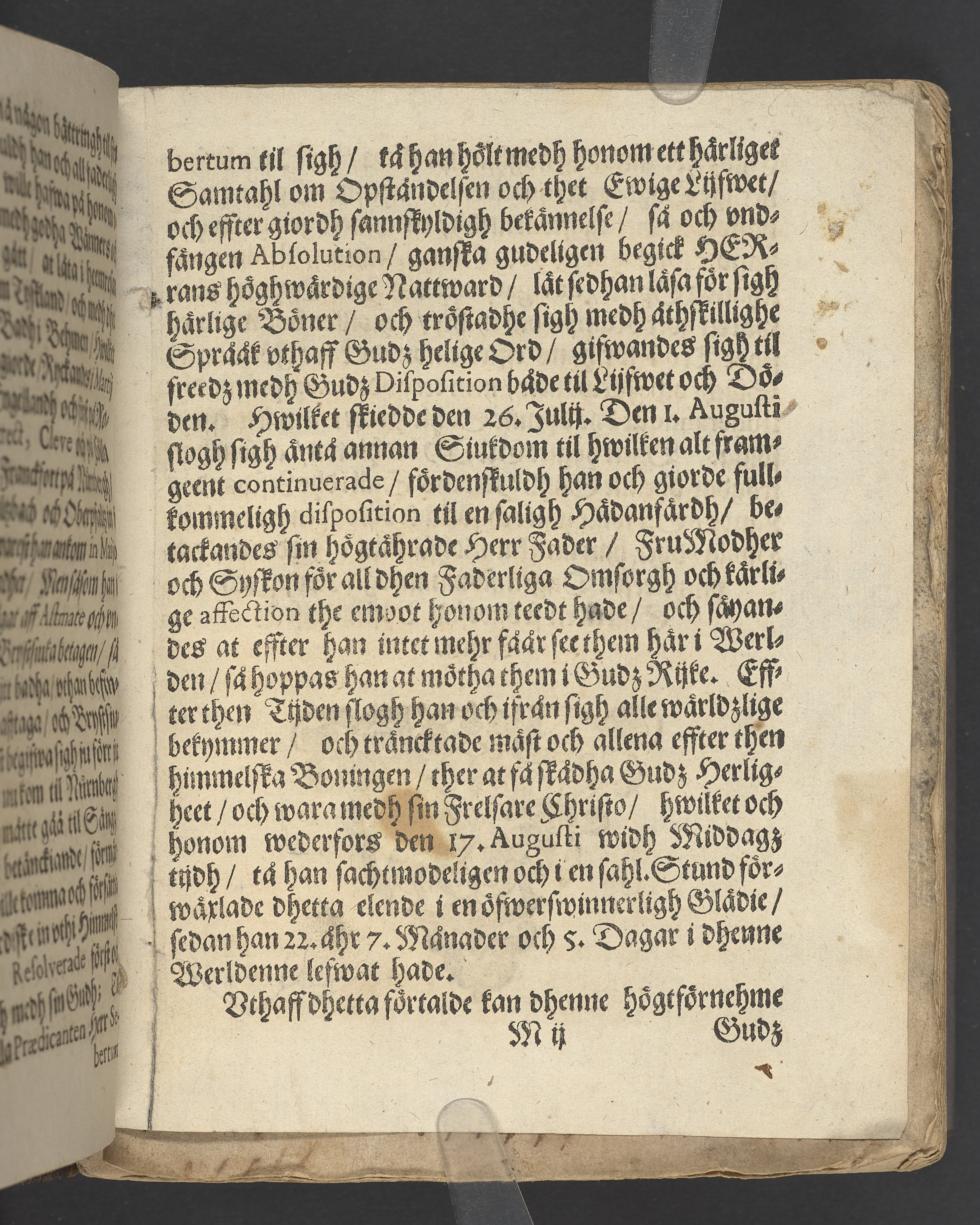 Sprängt snitt i rött. Högst upp på titelsidan anteckning i bläck med uppgifter om födelse- och dödsdatum för den avlidna. Mitt på sidan nära den inre marginalen med bläck "N. 33". Tryckt dedikation till fadern Claes Stiernsköld, samt modern och systrarna.