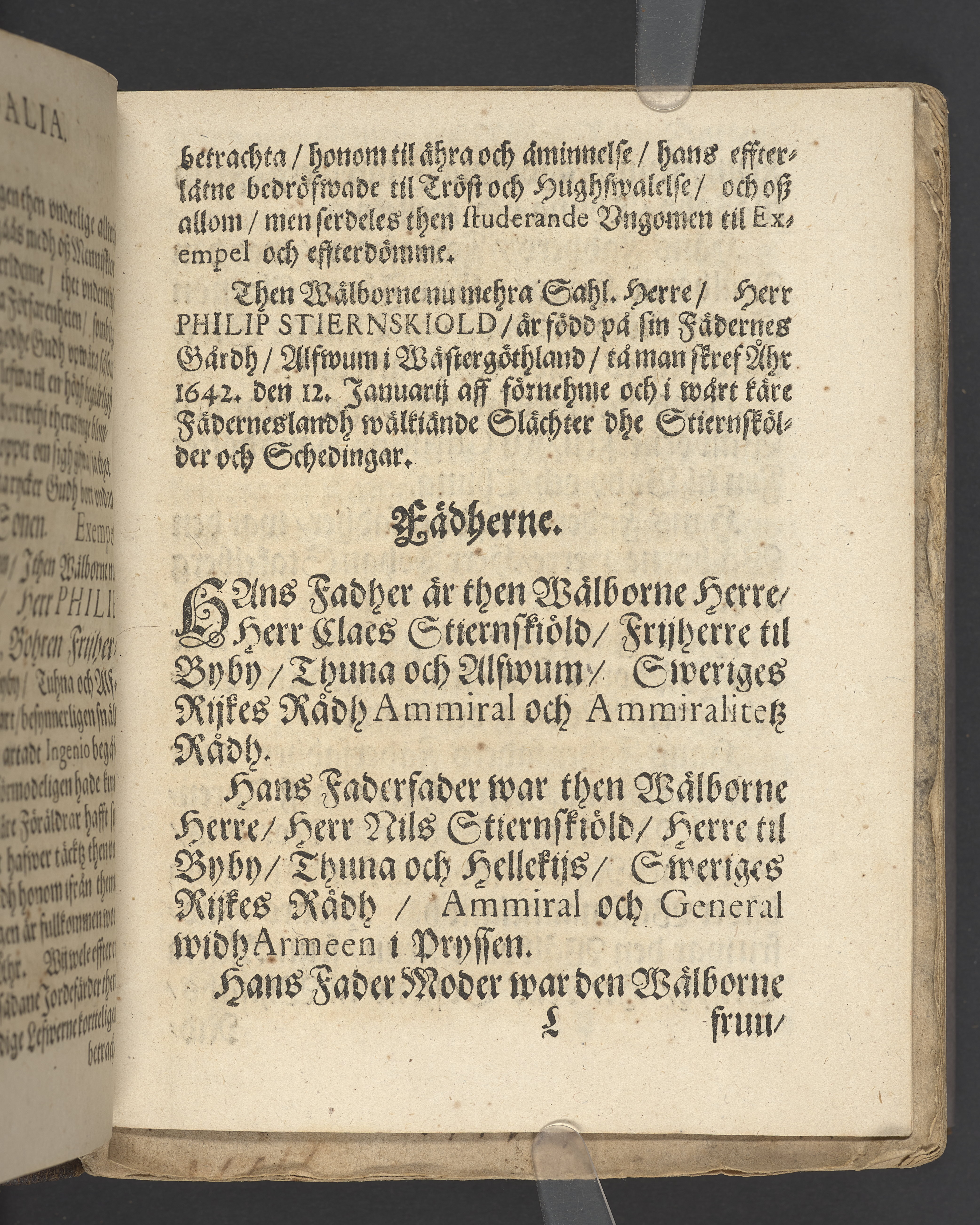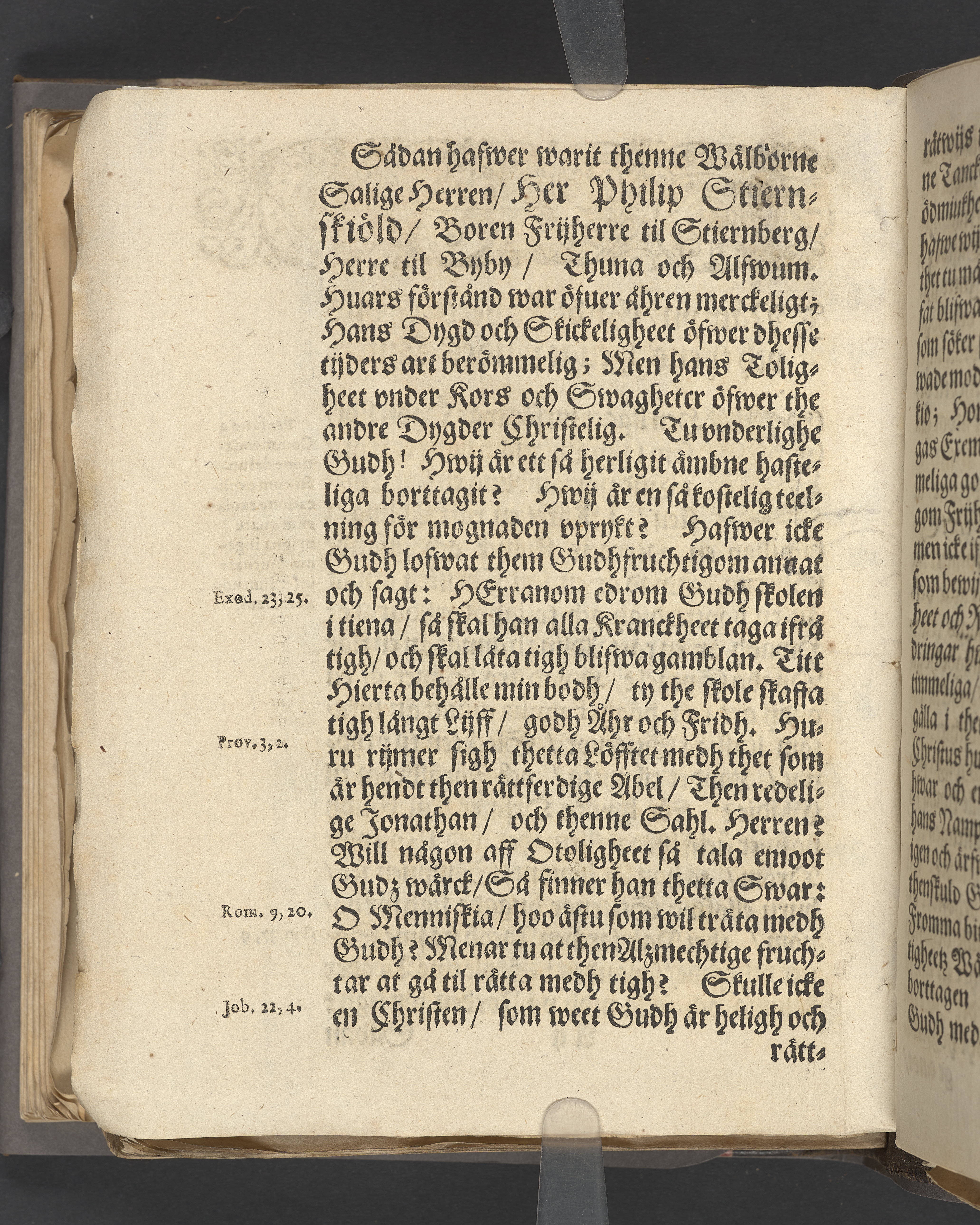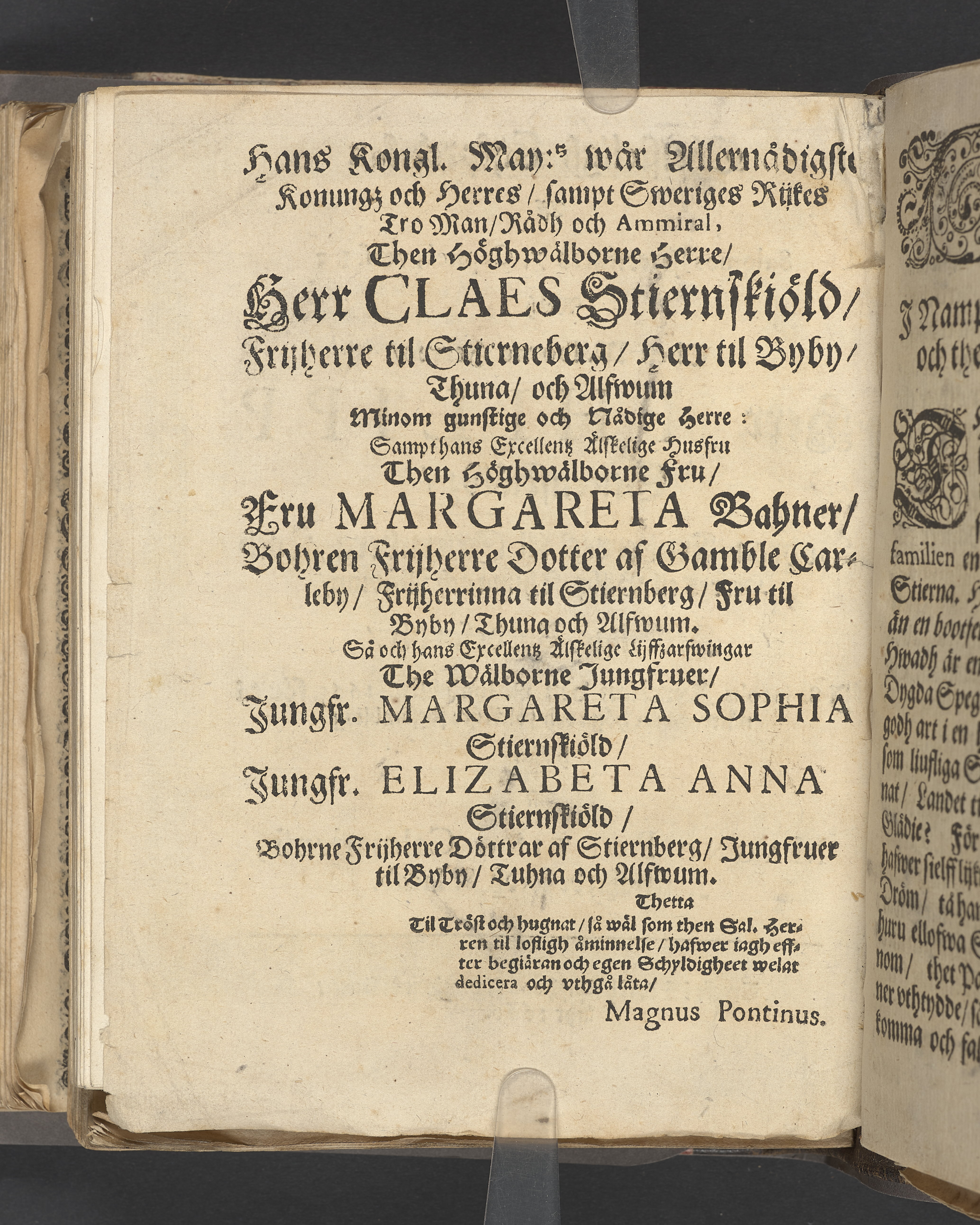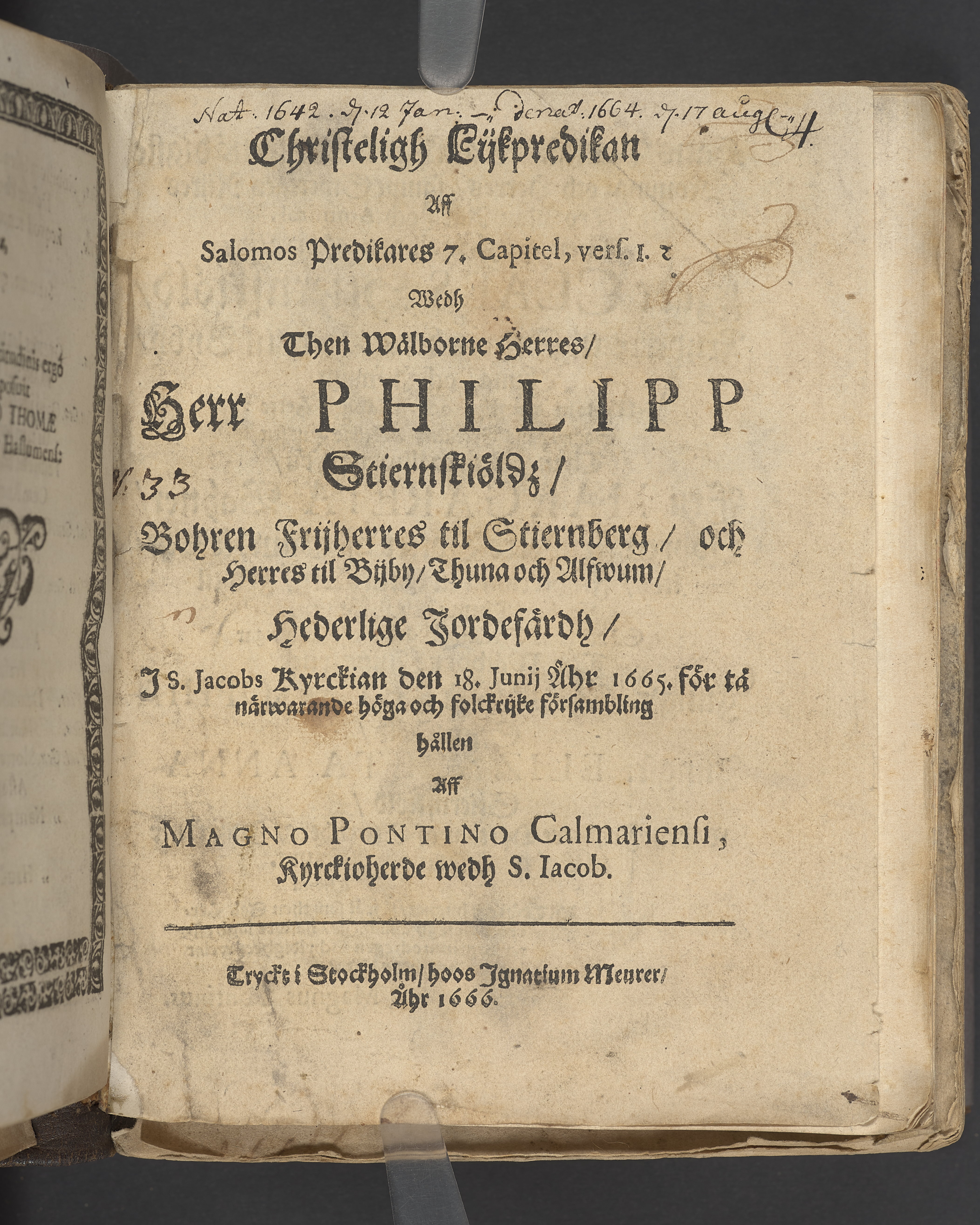 Christeligh Lijkpredikan Aff Salomos Predikare 7. capitel, vers. 1.2 Wedh Then Wälborne Herres/ Herr Philipp Stiernskiöldz/ Bohren Frijherres til Stiernberg/ och Herres til Bijby/ Thuna och Alfwum/ Hederlige Jordefärdh/ I S. jacobs Kyrckian den 18. Junij Åhr 1665. för tå närwarande höga och folckrijke försambling hållen Aff Magno Pontino Calmariensi, Kyrckioherde wedh S. Iacob. tryckt i Stockholm/ hoos Ignatium Meurer/ Åhr 1666.
