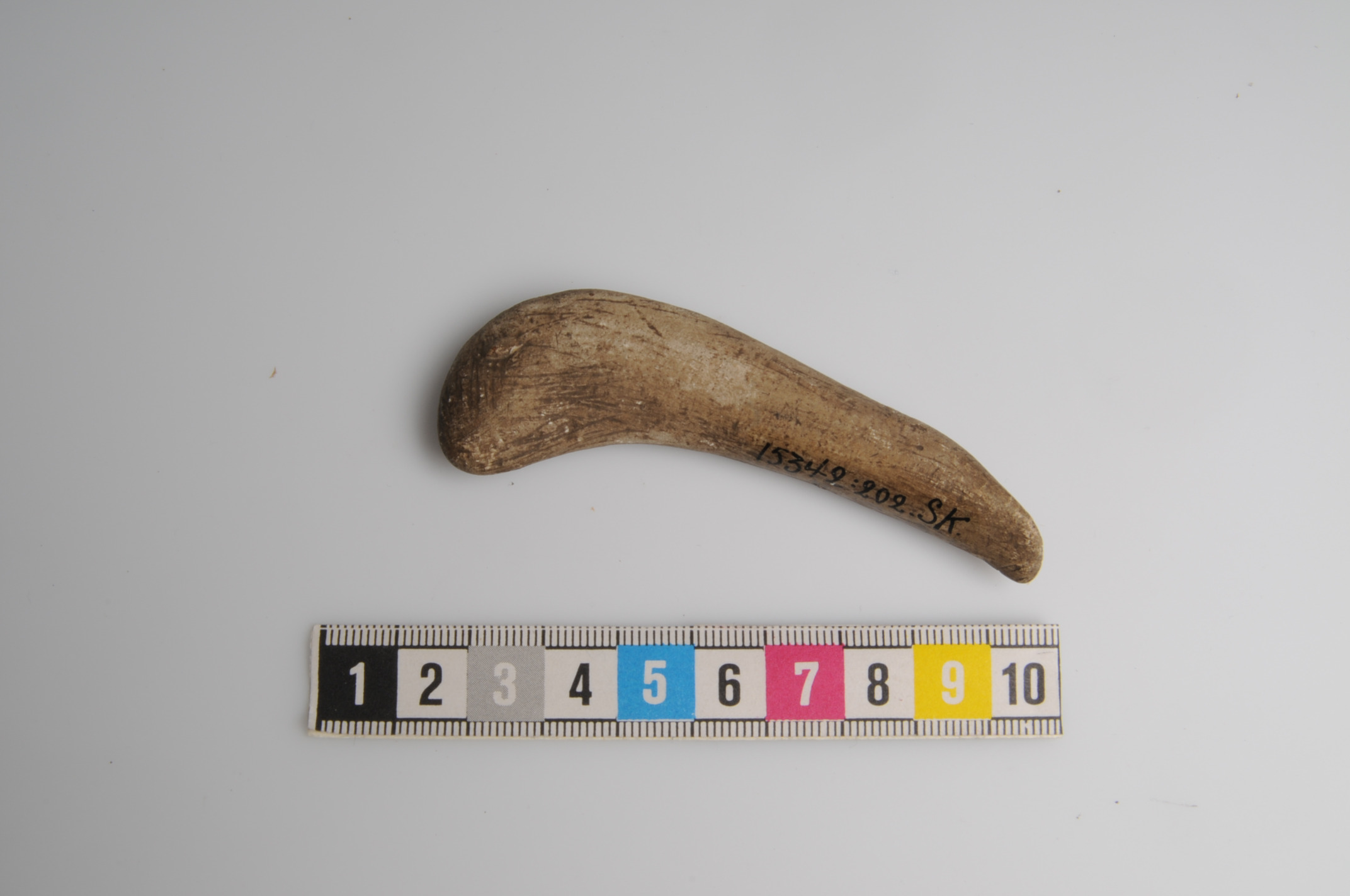 Flintnodul med kritöverdrag. Ristningade streck och en ögonliknande prick. Tolkad i katalogen som zoomorf figurin.